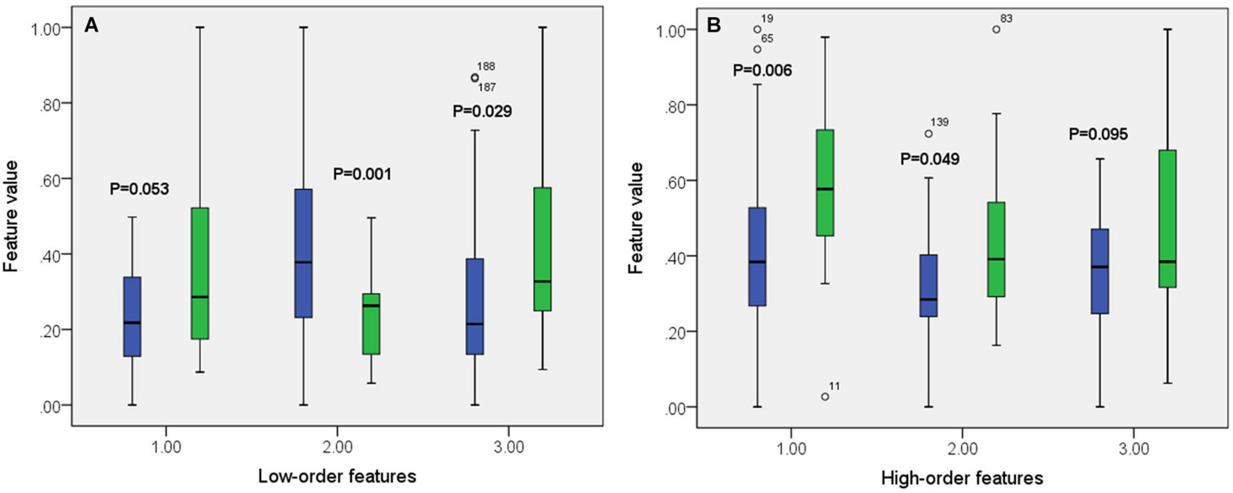 Boxplot of some features from both low-order (A) and high-order (B) networks. The green color corresponds to DNR group while the blue color corresponds to no-DNR group.