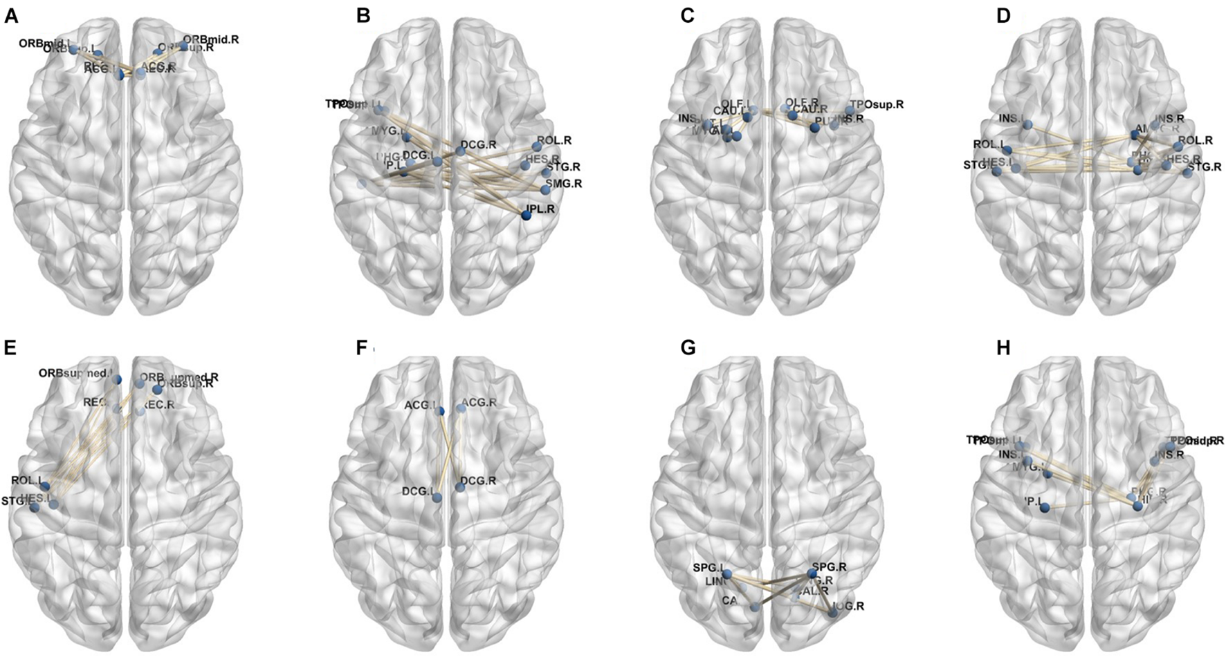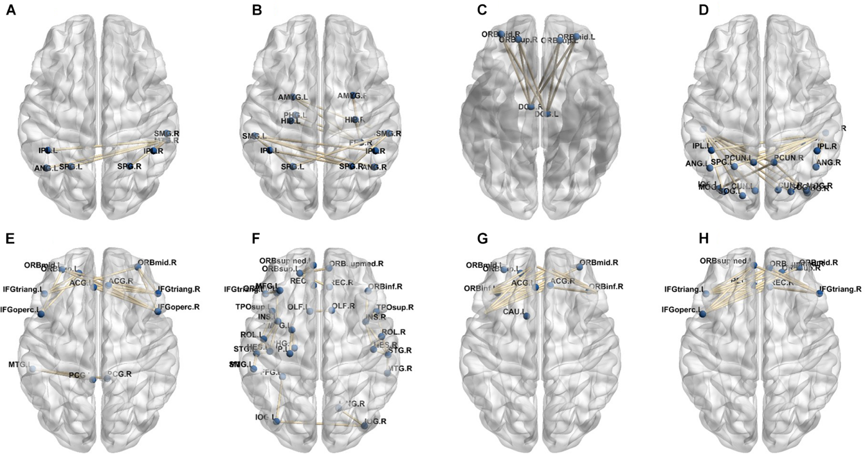 Clusters of low-order FC network (9–16). (A–H) Ninth to sixteenth clusters.