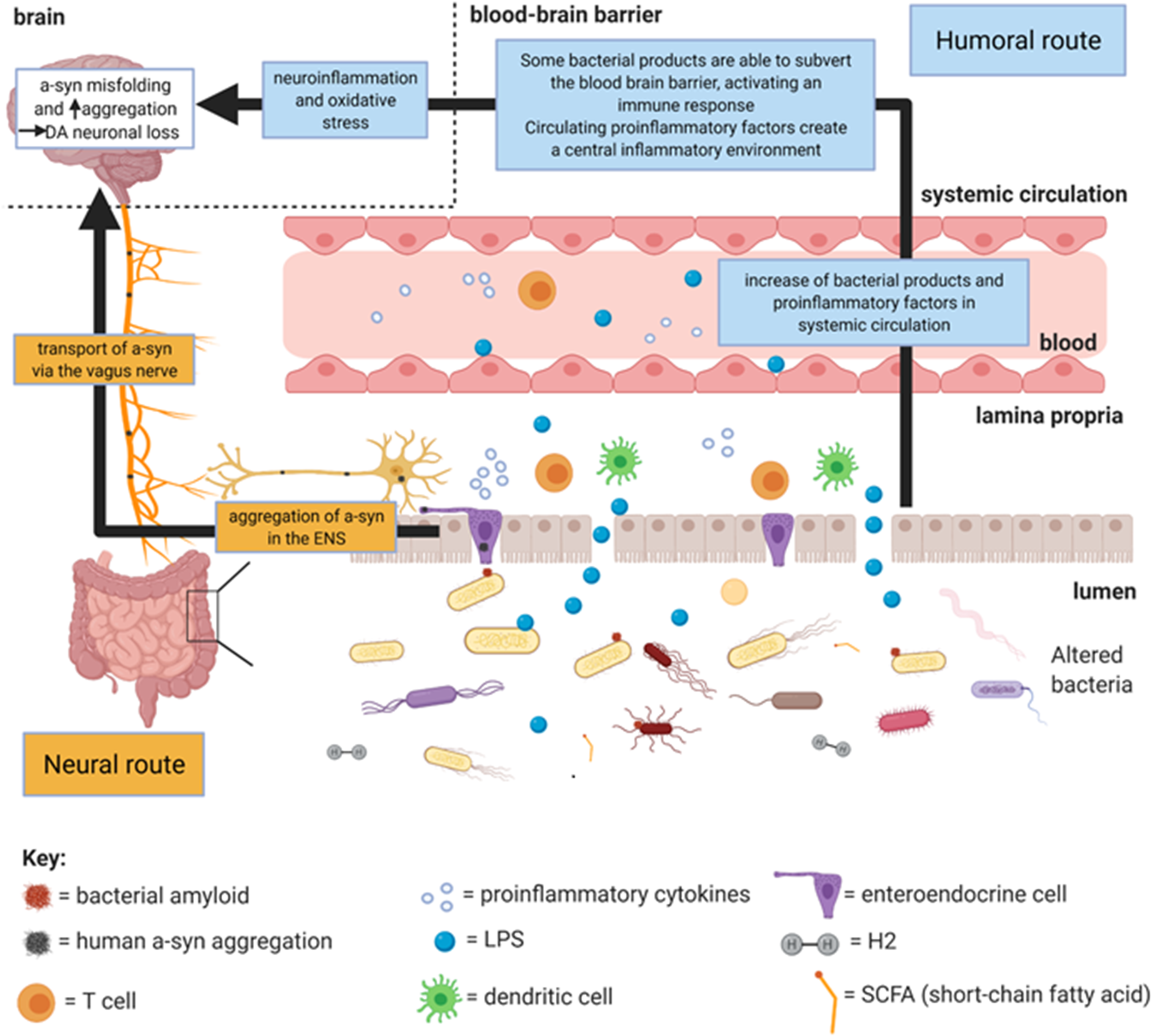 Braak’s hypothesis forms the basis of the neural route. Dysbiosis in the gut lumen leads to a-syn aggregation in enteric nerves. Indirectly, inflammation increases intestinal barrier permeability and hence mucosal inflammation, from translocation of bacteria and their products, which facilitates a-syn misfolding (Forsyth et al., 2011; Lema Tomé et al., 2013; Kelly et al., 2014). Directly, enteroendocrine cells (EECs) may propagate misfolded a-syn from the lumen, along their neuropods, to enteric nerves via functional synapses (Chandra et al., 2017). This may explain how Braak’s luminal exogenous pathogen could directly cause a-syn aggregation in the enteric nerves without violating the gut epithelium. Peripheral misfolded a-syn is proposed to be transported in a prion-like way between neurons, passing from the enteric nerves to the vagus nerve to the brain, where a-syn forms intracytoplasmic aggregates (Visanji et al., 2013). Exogenous a-syn fibrils enter neurons (Volpicelli-Daley et al., 2011), seeding intracellular a-syn aggregation both in vitro (Luk et al., 2009) and in vivo (Kordower et al., 2011; Holmqvist et al., 2014; Okuzumi et al., 2018), and upon exiting these neurons restarts the process (Lee et al., 2005).