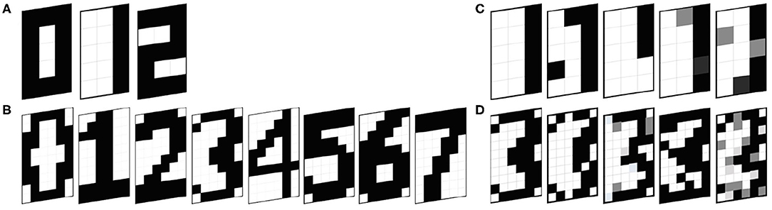 Figure 5. Reference patterns for (A) 5 × 3 ONN, (B) 10 × 6 ONN, and Test sets (C) associated to digit 1 for the 5 × 3 ONN, (D) associated to digit 3 for the 10 × 6 ONN.
