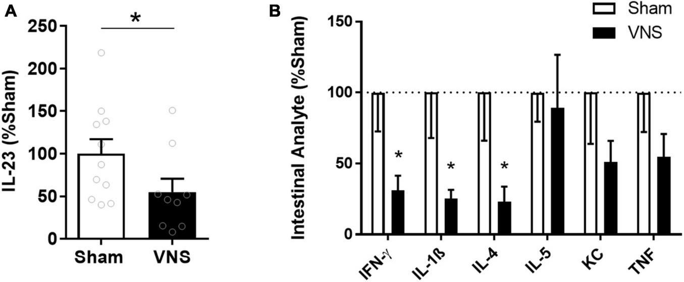Intestinal levels of select cytokines in VNS- or sham-treated animals with indomethacin-induced enteropathy. (A) Semi-quantitative measurements by western blot of intestinal IL-23 were normalized to the mean sham level. n = 9–11 per group. (B) Levels of select cytokines were measured by quantitative multiplexed electrochemiluminescence assay and normalized to the mean sham level. n = 5–6 per group. Data is presented as mean ± SEM. *p < 0.05 vs. sham.