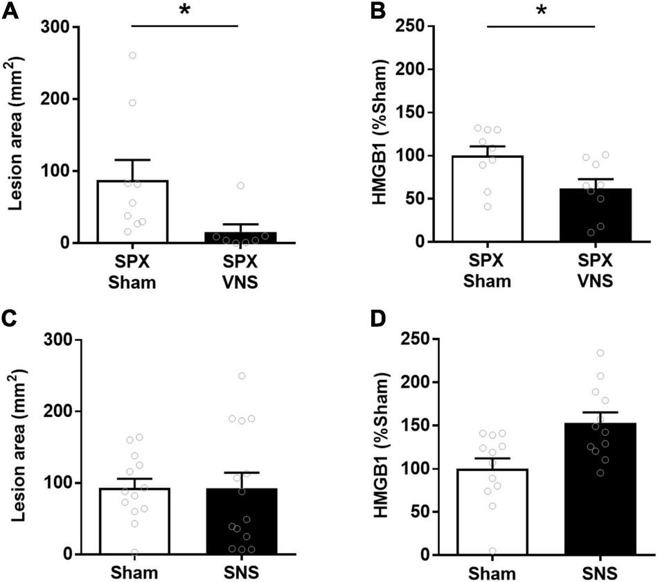 VNS reduced intestinal ulcerations in indomethacin-induced enteropathy independent of spleen. (A,B) Rats were subjected to splenectomy (SPX), followed by VNS or sham treatment and indomethacin administration. The small intestine lesion area was quantified at 24 h. Mean and SEM values are plotted (A, n = 7–9 per group; B 9 per group). (C,D) Rats were subjected to splenic nerve stimulation (SNS) or sham SNS surgery followed by indomethacin injection. The small intestine lesion area was quantified at 24 h. Serum HGMB1 was measured semiquantitatively by western blot and normalized to mean sham values (C, n = 13–14 per group; D, n = 12 per group). Data is presented as mean ± SEM. * p < 0.05 vs. sham.