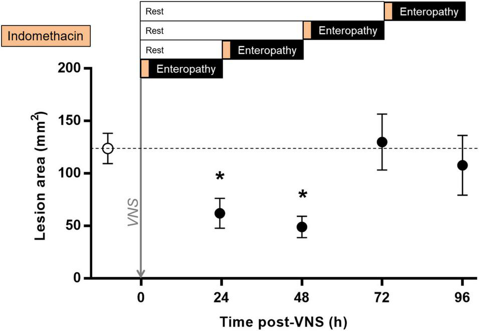 Sustained protection against indomethacin-induced intestinal ulcerations after VNS. Rats were subjected to VNS or sham surgery followed by a rest period of 0.5, 24, 48, or 72 h and subsequent subcutaneous injection of 10 mg/kg indomethacin in 5% sodium bicarbonate. Animals were injected systemically with Evans blue prior to euthanasia at 24 h after indomethacin injection. The small intestine was formalin-fixed, photographed and digitized. Total lesion area was quantified by a blinded scorer using Scion Image or ImageJ. Data is presented as mean ± SEM. *p < 0.05 vs. sham; n = 5–20 per group. Dotted line specifies the mean of the sham group.