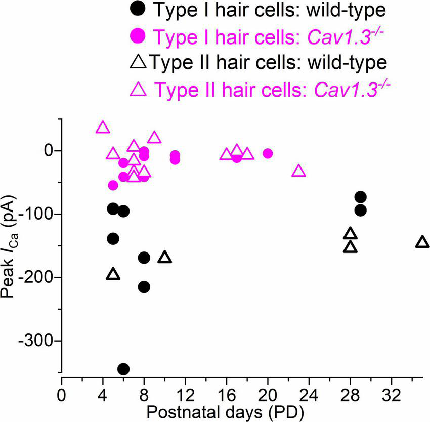 We tested whether the size of ICa changed with age in hair cells from wild-type and CaV1.3–/– mice. The peak ICa amplitude, which was detected between −21 and −10 mV, was plotted as a function of postnatal day (Figure 5). The size of ICa in both type I and type II hair cells appears to be comparable between early and late postnatal ages in both wild-type and CaV1.3–/– mice.