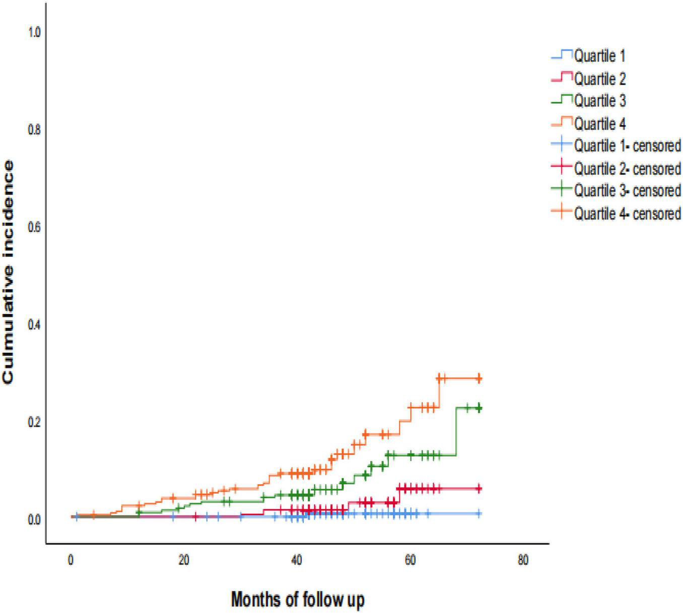 Kaplan-Meier estimates of probability of cumulative incidence (%) for stroke. Log-rank test: P < 0.001; Quartile 1 was used as reference group.
