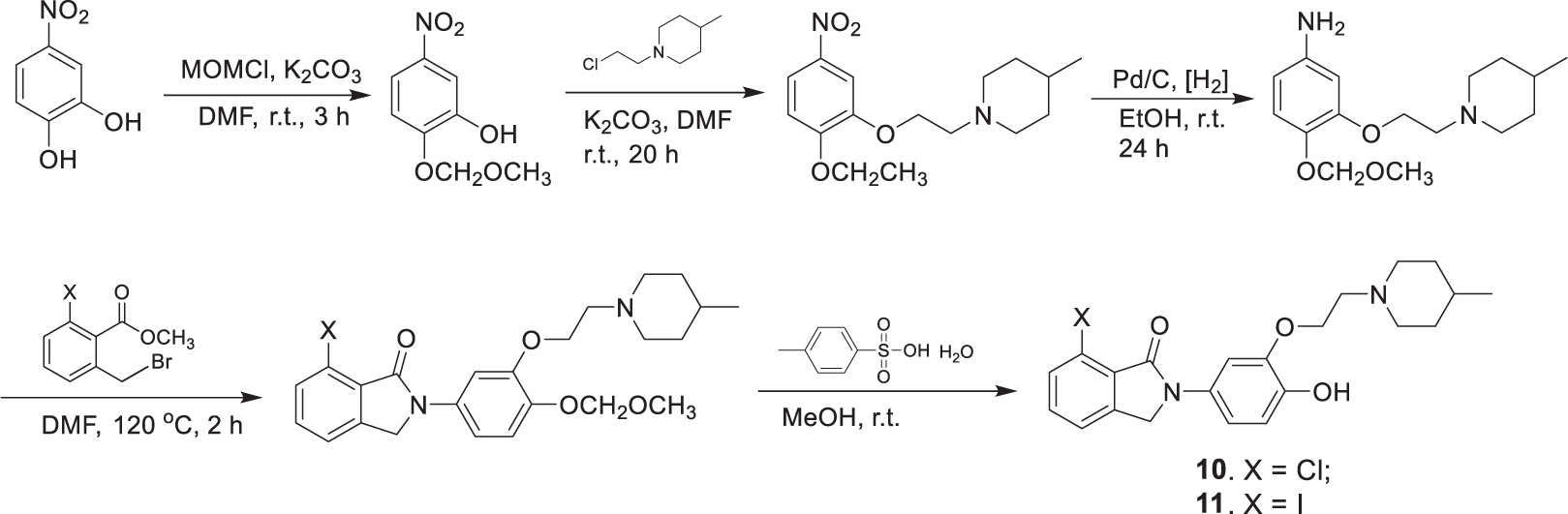 Compounds 6–9 were synthesized in three steps (Scheme 1), which include alkylation of the phenols with N-(2-chloroethyl)-4-methylpiperidine, reduction of the nitro compounds using Pd/C, and condensation of the resulting phenylamines with the corresponding 6-halogen-2-bromomethylbenzoate. The synthesis of the precursors 10 and 11 followed the same procedure, except that 2-(methoxymethoxy)-5-nitrophenol was used in the alkylation reaction. The MOM protection group was then cleaved with excess p-toluenesulfonic acid to afford the hydroxyphenylisoindolones as the radiolabeling precursors (Scheme 2).