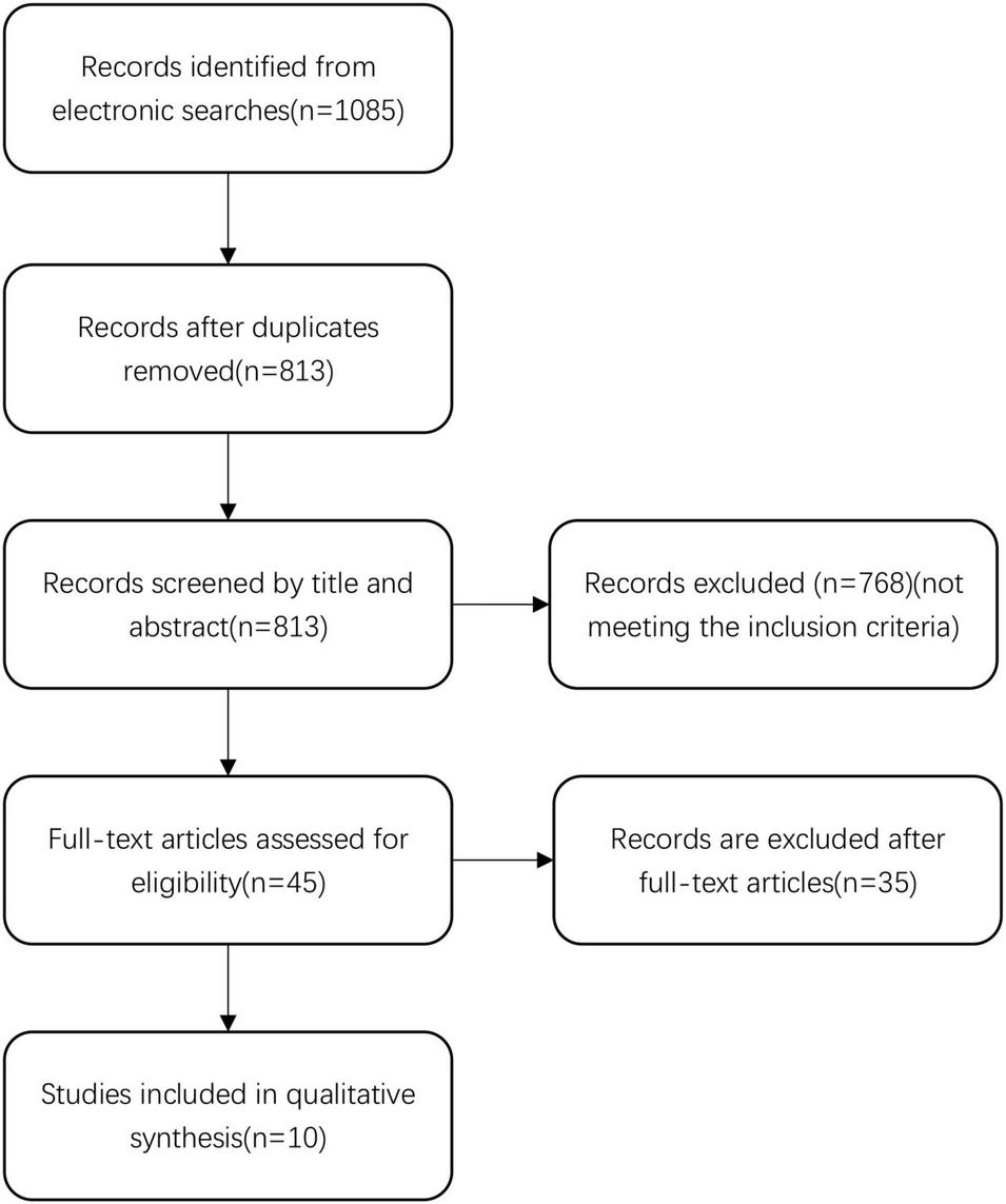 We identified 1,085 records in the initial search. After removing 272 duplicate records, we screened the title and abstract of the remaining 813 records. We excluded 768 records that did not meet the inclusion criteria, and reviewed the full text reports of the remaining 45 records. After the full-text review, we excluded 35 records. Finally, 10 articles were selected for inclusion in the final analysis (Sun et al., 2005; Dran et al., 2007; Delgado-López et al., 2009; Chan et al., 2015; Qian et al., 2017; Fountas et al., 2019; Mebberson et al., 2020; Lodewijkx et al., 2021; Ng et al., 2021). Details of the literature search and review are displayed in Figure 1.