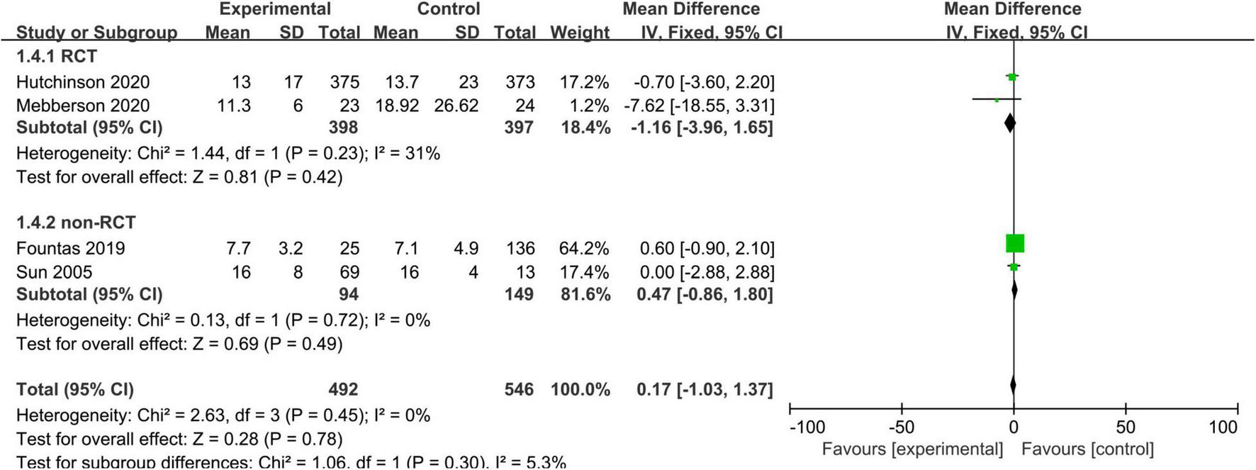 Three studies, consisting of 290 patients, reported the length of hospitalization. We used a fixed-effects model due to no substantial heterogeneity among the studies (I2 = 0%, p = 0.45). The pooled results showed no statistically significant difference in the length of hospitalization between the adjuvant corticosteroid group and surgery alone group (MD = 0.17, 95% CI = –1.03 to 1.37, p = 0.78) (Figure 5).