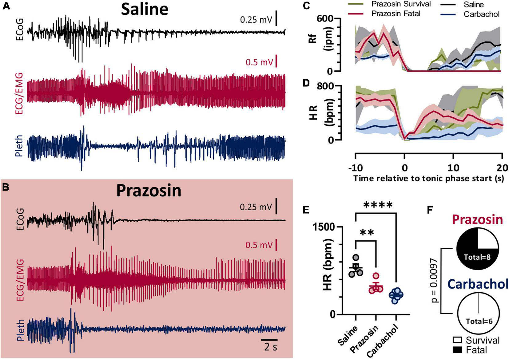 Blockade of alpha-1 adrenergic receptors drives non-fatal seizures into fatal seizures. (A,B) ECoG, ECG, and breathing recordings during an HC stimulated seizure after injection of saline (A) or prazosin (1 mg/kg; B). (C) Mean (lines) and SEM (shaded) of peri-ictal breathing rate when saline (black, n = 4), prazosin survival (green, n = 2), prazosin fatal (maroon, n = 4), or carbachol (blue, n = 5) was injected 15 min prior to seizure stimulation. (D) Mean (lines) and SEM (shaded) of peri-ictal heart rate when saline (black), prazosin (green for survival and purple for fatal), or carbachol (blue) was injected 15 min prior to seizure stimulation. (E) Peak postictal heart rate was lower for seizures induced after injection of prazosin or carbachol compared to saline (p = 0.0028 and p < 0.0001, and d = 2.53 and 4.57, respectively; Tukey’s multiple comparison test after 1-way ANOVA, p < 0.0001, F(2, 11) = 25.96). (F) Proportion of fatal and non-fatal seizures under conditions of prazosin and carbachol injection (p = 0.0097, Fisher’s Exact Test). **p < 0.01 and ****p < 0.0001.