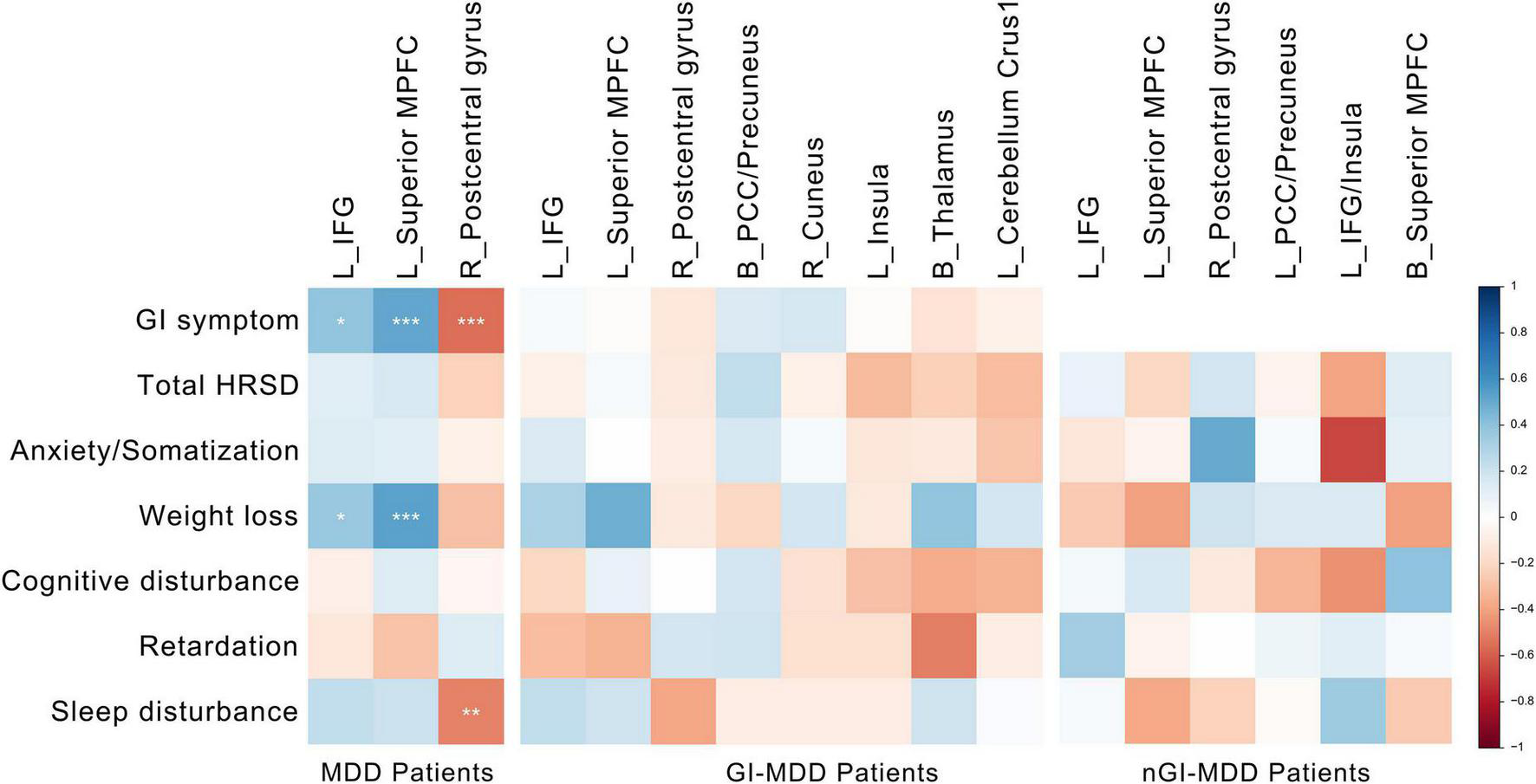 For all MDD patients, their PAS scores of the left IFG and superior MPFC were positively correlated with the severity of GI symptoms and weight loss. Additionally, the severity of GI symptoms and insomnia was negatively correlated to the PAS scores of the right postcentral gyrus (Figure 5). Although potential inverse associations were found between the scores of weight loss and the PAS scores of the right postcentral gyrus, as well as between the severity of retardation symptoms and the PAS scores of the left superior MPFC, their significances did not pass the Benjamini-Hochberg correction.