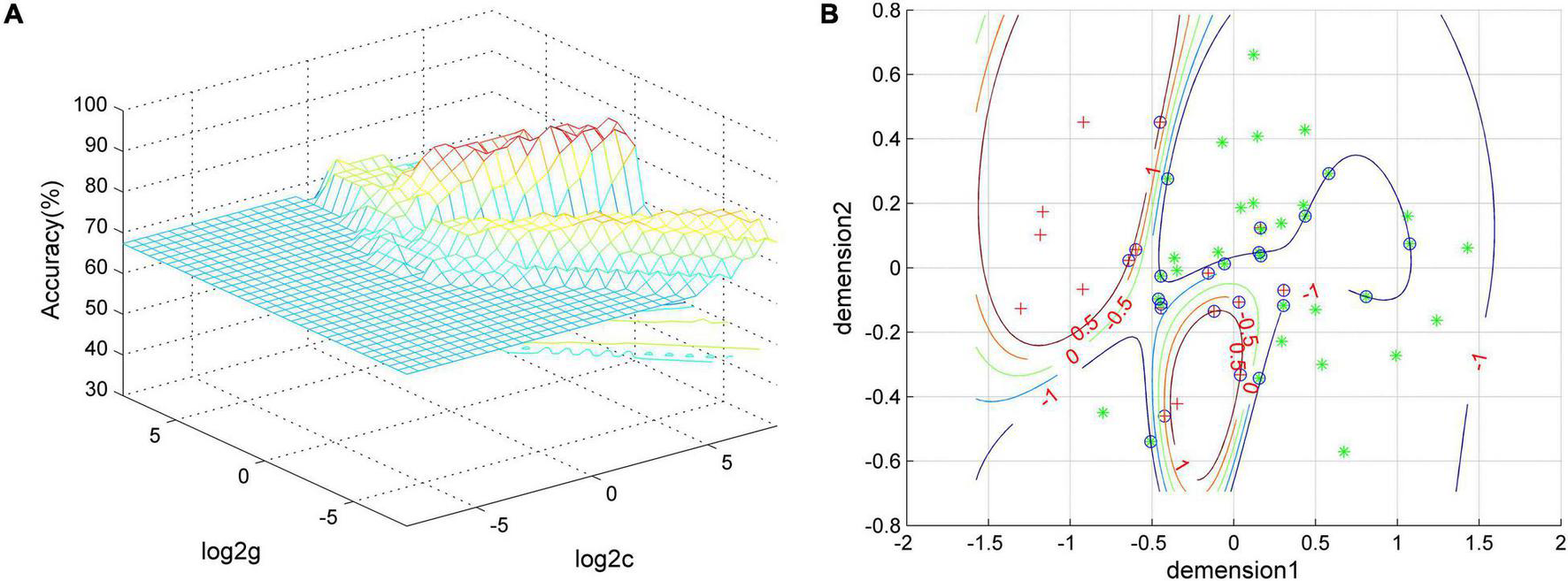 Figure 6. The visualization of SVM classification using the combination of the PAS scores of the left IFG and left superior MPFC. (A) SVM parameter result of 3D view and (B) classified map of the results. Green asterisks represent the GI-MDD patients, and red crosses represent nGI-MDD patients. GI-MDD, major depressive disorder with gastrointestinal symptoms; IFG, inferior frontal gyrus; MPFC, medial prefrontal cortex; nGI-MDD, major depressive disorder without gastrointestinal symptoms; PAS, parameter of asymmetry; SVM, support vector machine.