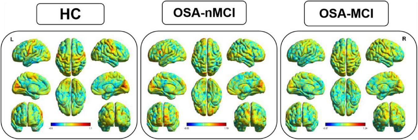 The distribution patterns of dynamic amplitude of low-frequency fluctuation (dALFF) in the healthy control (HC), OSA without MCI (OSA-Nmci), and OSA with MCI (OSA-MCI) groups.