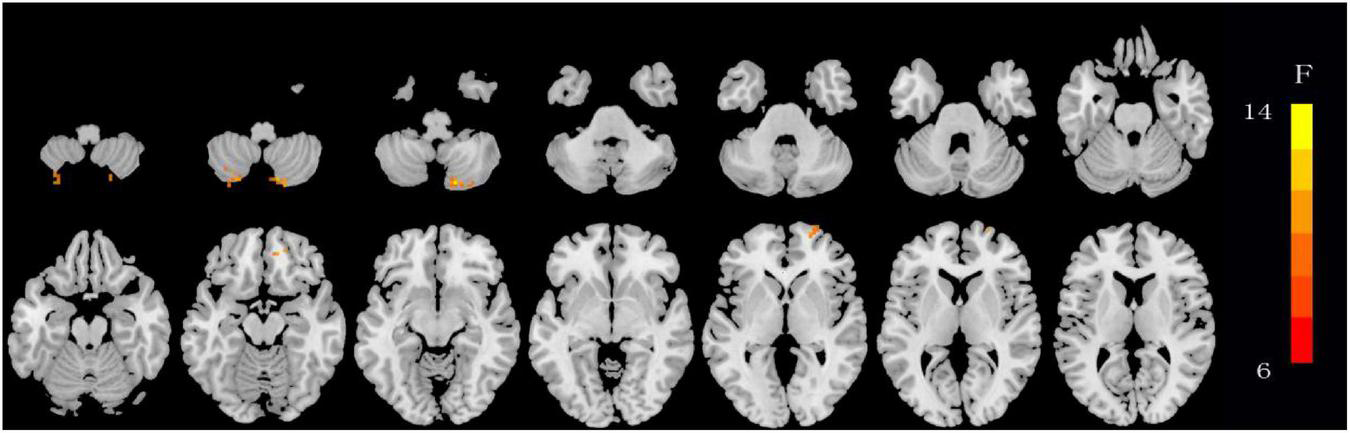 | ANOVA | L cerebellum posterior lobe | 17 | −30 | −72 | −54 | 8.408 |