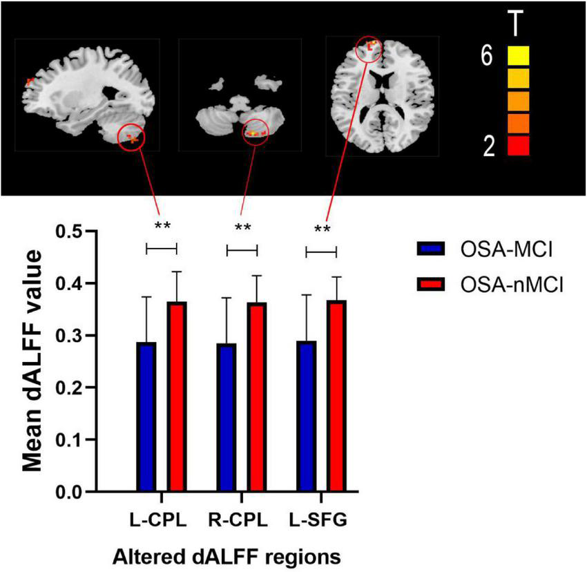 Maps showing differences in dynamic amplitude of low-frequency fluctuation (dALFF) in the OSA without MCI (OSA-nMCI) with OSA with MCI (OSA-MCI) groups. Differences between the groups were calculated using post hoc analysis based on a two-sample T-test with the threshold set at voxel P < 0.05 and cluster P < 0.005 with GRF correction. ** means that there are significant difference between the groups.