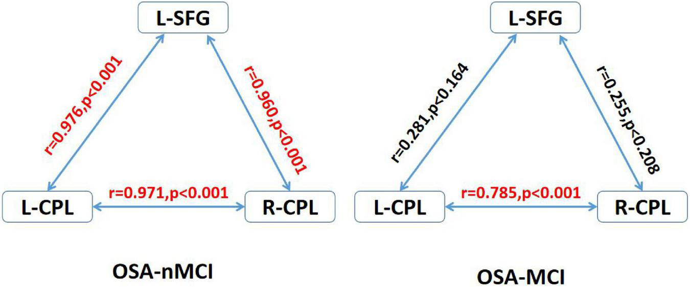 Correlations between differences regions in the OSA without MCI (OSA-nMCI) with OSA with MCI (OSA-MCI) groups. R-CPL, right cerebellum posterior lobe; L-CPL, left cerebellum posterior lobe; L-SFG, right superior frontal gyrus; red, significantly correlated.