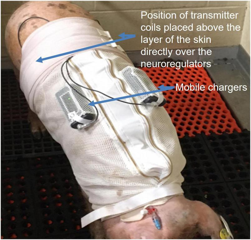 Alloxan treated Yucatan swine wore a specially designed jacket to house two of the ReShape Lifesciences Inc. Viking mobile chargers. Transmitter coils above the layer of the skin were connected to the mobile chargers to charge the implanted neuroregulators with a RF signal between experiments. Settings for stimulation and high frequency alternating current (HFAC) parameters were also programmed into the neuroregulators using a laptop computer and application software via the mobile chargers and transmitter coils. Swine were trained for 7 days to wear the jacket. During the charging sessions the swine were not restrained and there was no apparent stress to the animals.