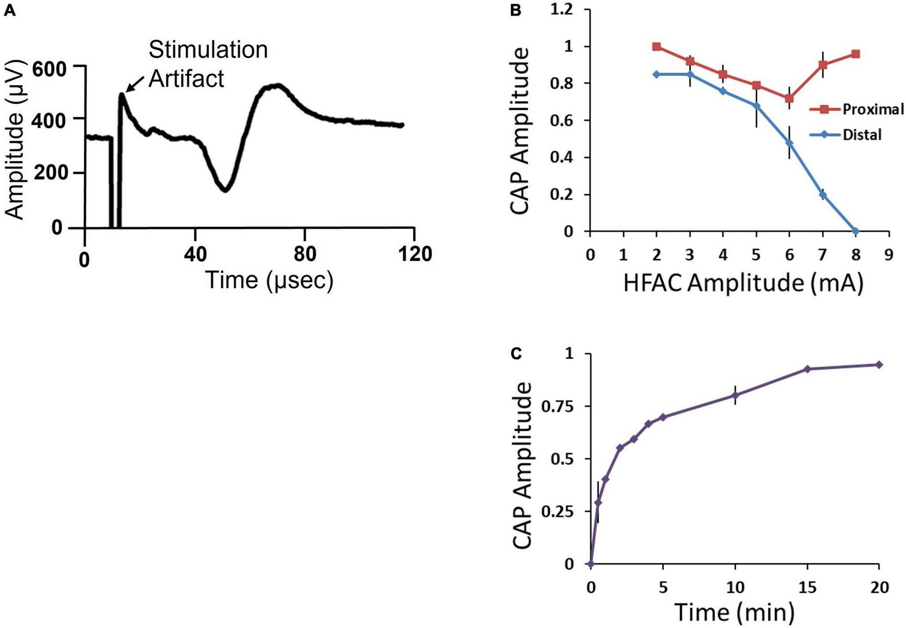 The distal and proximal stimulation electrodes both elicited a CAP (Figure 7A). However, when HFAC was applied the distal CAP amplitude decreased in a current dependent manner with consistent full block at 8 mA (Figure 7B). The proximal electrode was used as a control to test for repetitive firing of action potentials which has been shown to occur with the application of HFAC (Kilgore and Bhadra, 2013). If the HFAC elicited anti- and ortho-dromic action potentials there would be collision blocks with action potentials elicited by the stimulation electrodes decreasing the amplitude of the CAPs. There was a decrease in the CAP produced by the proximal electrode in a current dependent manner at HFAC amplitudes less than 6 mA which peaked at an average of a 28% decrease (Figure 7B). However, as the HFAC current amplitude was increased the proximal CAP increased to baseline values with only an average of a 4% decrease at 8 mA. Following cessation of HFAC the distal CAP amplitude returned to 90% of its baseline amplitude within 15 min, and ≥95% at 20 min, on average (Figure 7C). The conduction block that persisted following the cessation of HFAC has been reported previously and termed a “carry-over” effect (Waataja et al., 2011; Cuellar et al., 2012; Kilgore and Bhadra, 2013).