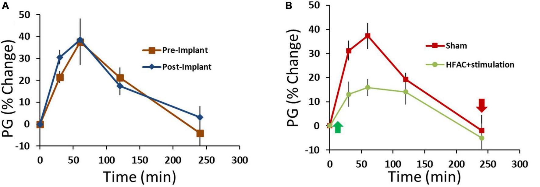 Application of high frequency alternating current (HFAC) to the hepatic branch of the vagus nerve with simultaneous stimulation of the celiac branch of the vagus nerve increased performance on an oral glucose tolerance test (OGTT) compared to pre-device initiation OGTTs in Alloxan treated swine. (A) Results from an OGTT conducted prior to implant of the device and following the implant of device were similar; suggesting that the implant itself did not change glycemic control. n = 3 swine. (B) Application of HFAC + stimulation 5 min following the initiation of the OGTT significantly improved performance on the OGTT in Alloxan treated swine n = 6 swine. Green arrow depicts when HFAC + stimulation was turned on and red arrow depicts when HFAC + stimulation was tuned off. n = 6 swine. Error bars are SEM.