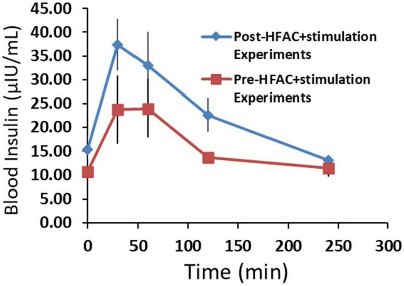 The insulin response was not attenuated following six applications of high frequency alternating current (HFAC) + stimulation (Post-HFAC + stimulation Experiments) vs. Sham (Pre-HFAC + stimulation Experiments). n = 3 swine Error bars are SEM.