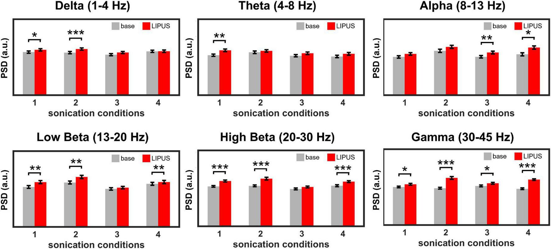 Average power spectral density (PSD) obtained from the right motor cortex during baseline and LIPUS stimulation with unilateral (sonication conditions 1 and 4) and bilateral (sonication conditions 2 and 3) stimulation protocols. (*p < 0.05, **p < 0.01, ***p < 0.001, paired t-test.).