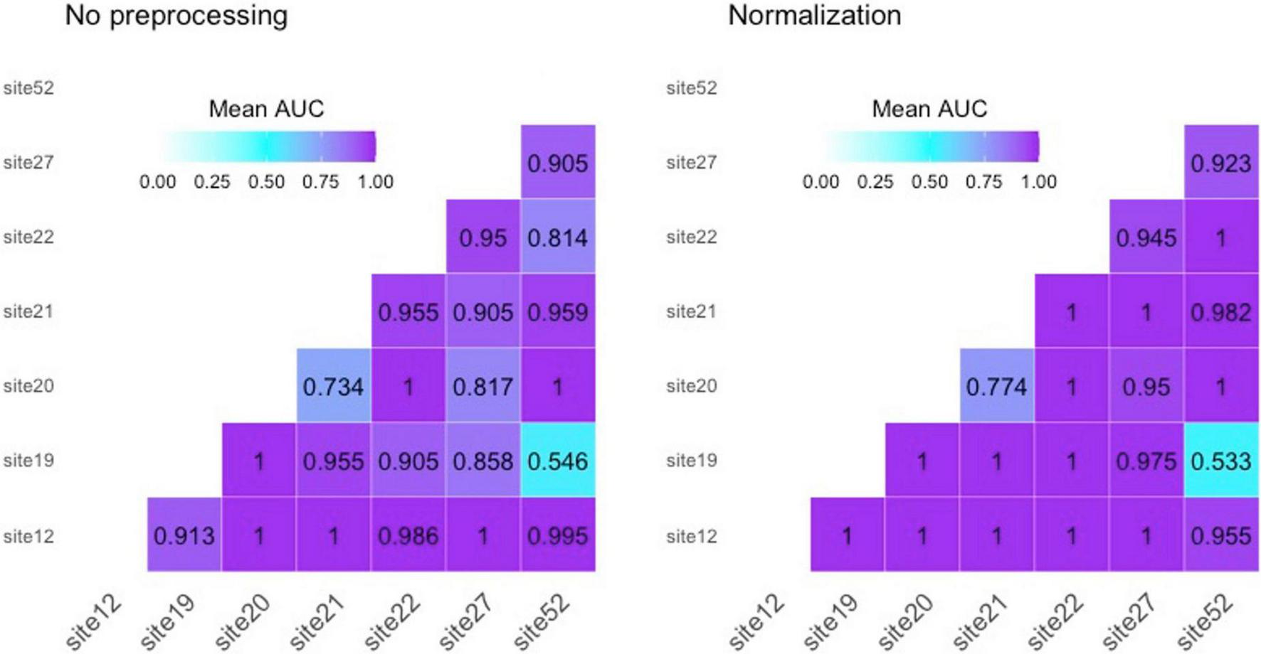 Area under the receiving operating characteristic curves (AUCs) for “site vs. site” classification on healthy controls. Left panel reports performances for not pre-processed radiomics features; right panel reports results using radiomics features from normalized MRI.