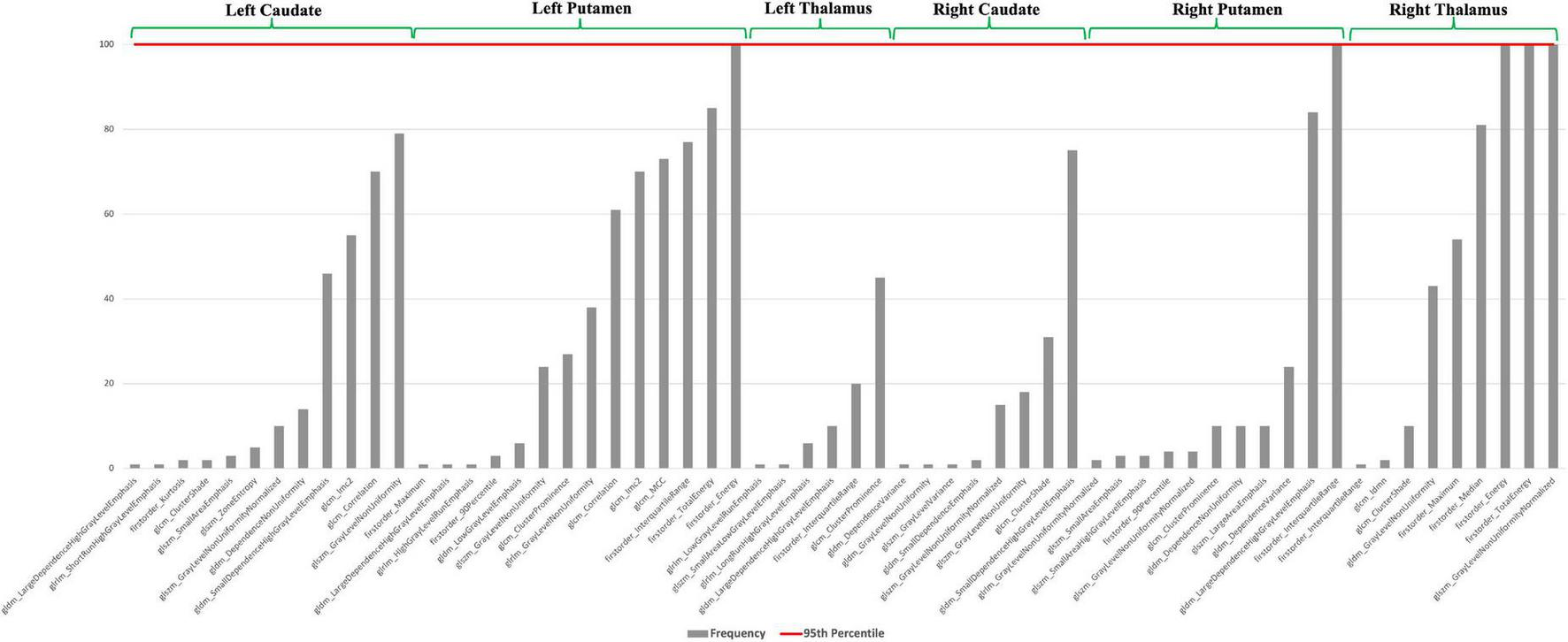 As shown in Figure 5, we found five features over 95th percentile as most stable, with a predominance of radiomics measures in the right thalamus, involving energy features as measure of the magnitude of voxel values in an image, and “Gray Level Non-Uniformity Normalized” measure, quantifying the variability of gray-level intensity values in the image. Moreover, we found features in putamen, bilaterally, as most frequent predictors.