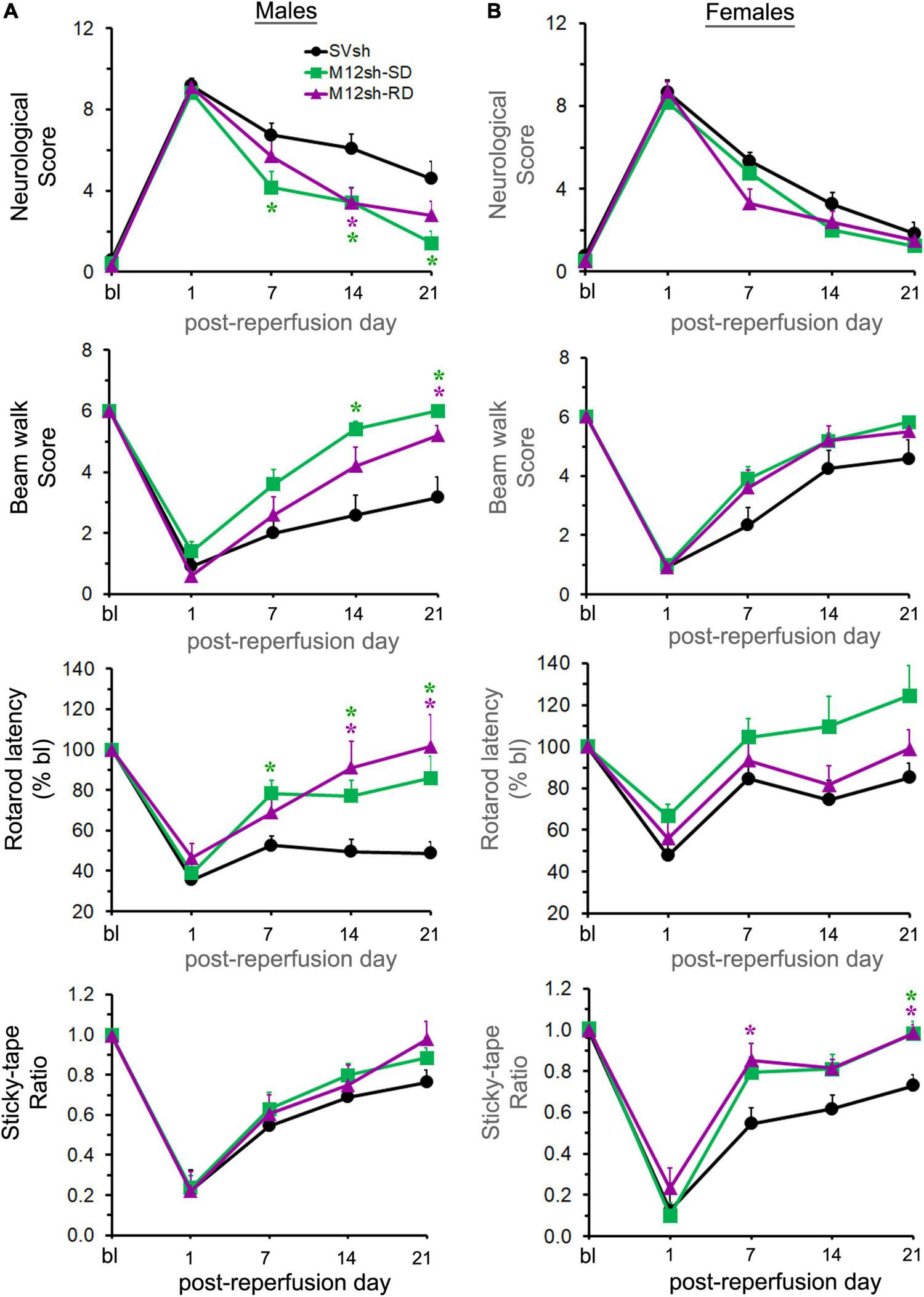Statistical analysis of neurological scores obtained from the mNSS assessment revealed a significant effect of treatment in males but not in females (Figures 5A,B). A subsequent post-hoc test in males revealed that neurological scores were significantly lower in the M12sh-SD group (p = 0.0357 on day 7, p = 0.0426 on day 14, and p = 0.0175 on day 21) and the M12sh-RD group (p = 0.0384 on day 14) compared to the SVsh group. The difference in neurological scores between the M12sh-SD and M12sh-RD groups was not statistically significant at any of the time points examined.