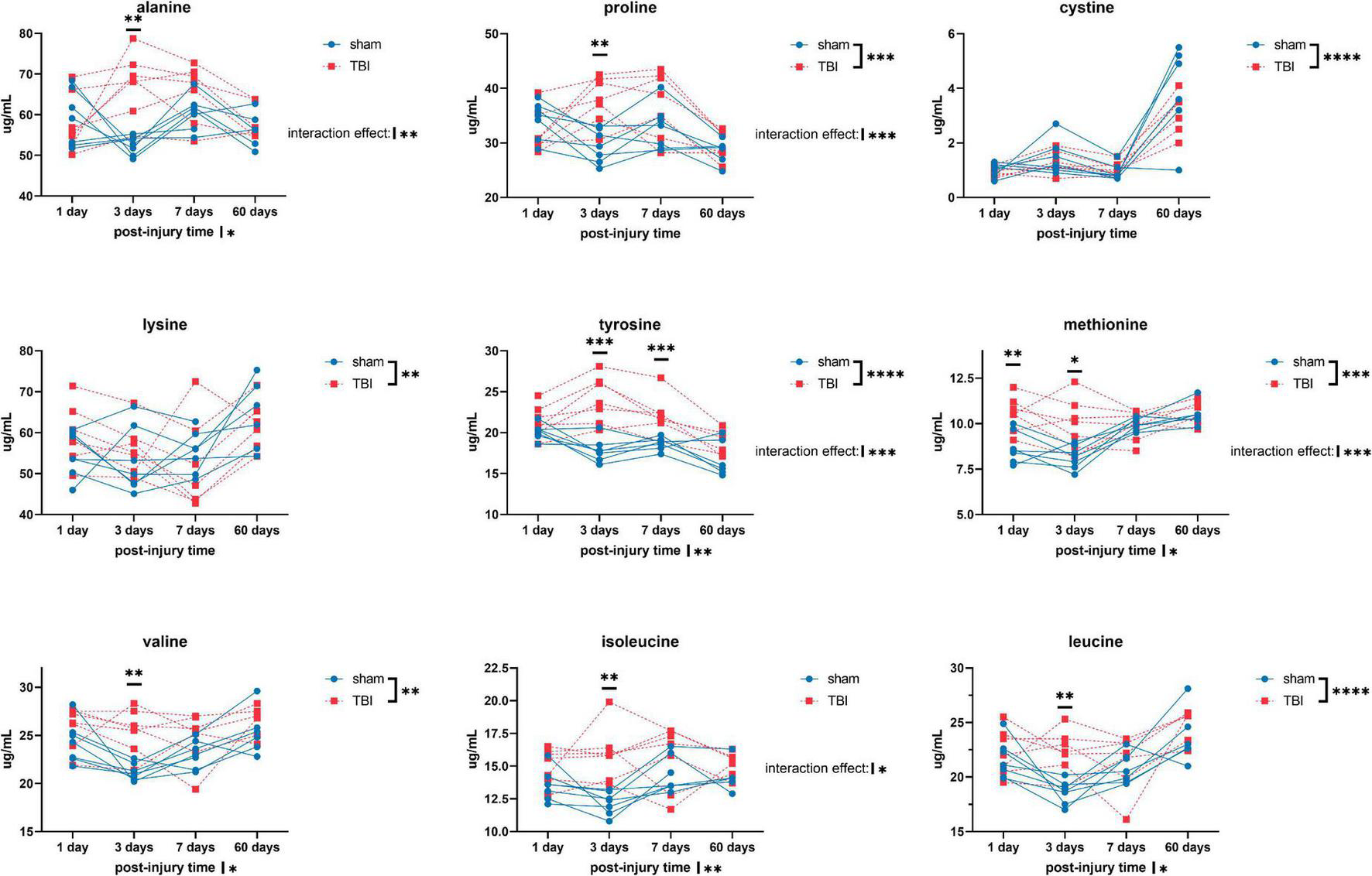 Plasma levels of amino acids: alanine, proline, cystine, lysine, tyrosine, methionine, valine, isoleucine, and leucine of sham and TBI animals at day one, three, seven, and sixty post-procedure. Asterisks (*) next to sham/TBI legends, post-injury time axis label, and interaction effect indicated statistically significant group, post-injury time, and group × post-injury time effects, respectively, in ANOVA. *On the graph at each timepoint indicated significant difference between TBI and sham animals at each timepoint, Fisher’s Least Squared Difference post-hoc test. *P-value < 0.05, **P-value < 0.01, ***P-value < 0.001, ****P-value < 0.0001.