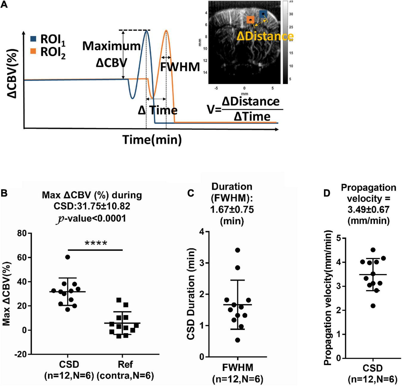 Figure 4. (A) Measurement of relative changes in CBV (ΔCBV), full-width half-magnitude (FWHM) of duration, and propagation velocity (V) of hemodynamic changes during CSD. Summarized data of CSD-induced maximum increase in (B) ΔCBV, (C) FWHM, and (D) propagation rate. n: number of CSD; N: number of animals. Data are reported as means ± SD. ****P < 0.0001 between hemispheres.