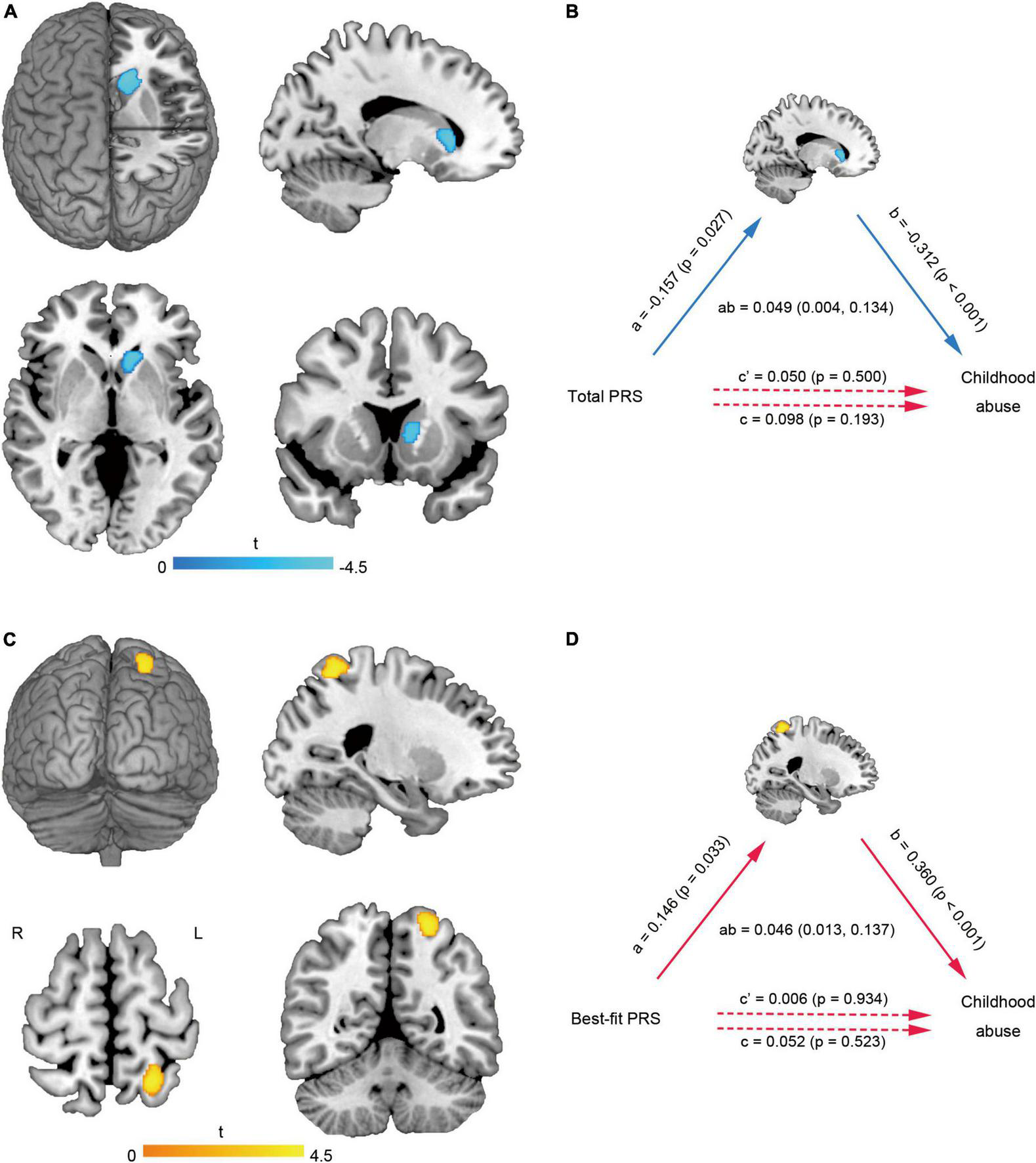 Figure 2. Brain gray matter alterations related to childhood abuse and mediation analysis. The GMV of left caudate (A) was negatively correlated with the total abuse score. The left caudate changes mediated the effect of total PRS on childhood abuse score (B). The GMV of left superior parietal lobule (C) was positively correlated with the total abuse score. The left superior parietal lobule changes mediated the effect of best-fit PRS on childhood abuse score (D). GMV, gray matter volume; L, left; PRS, polygenic risk score; R, right.