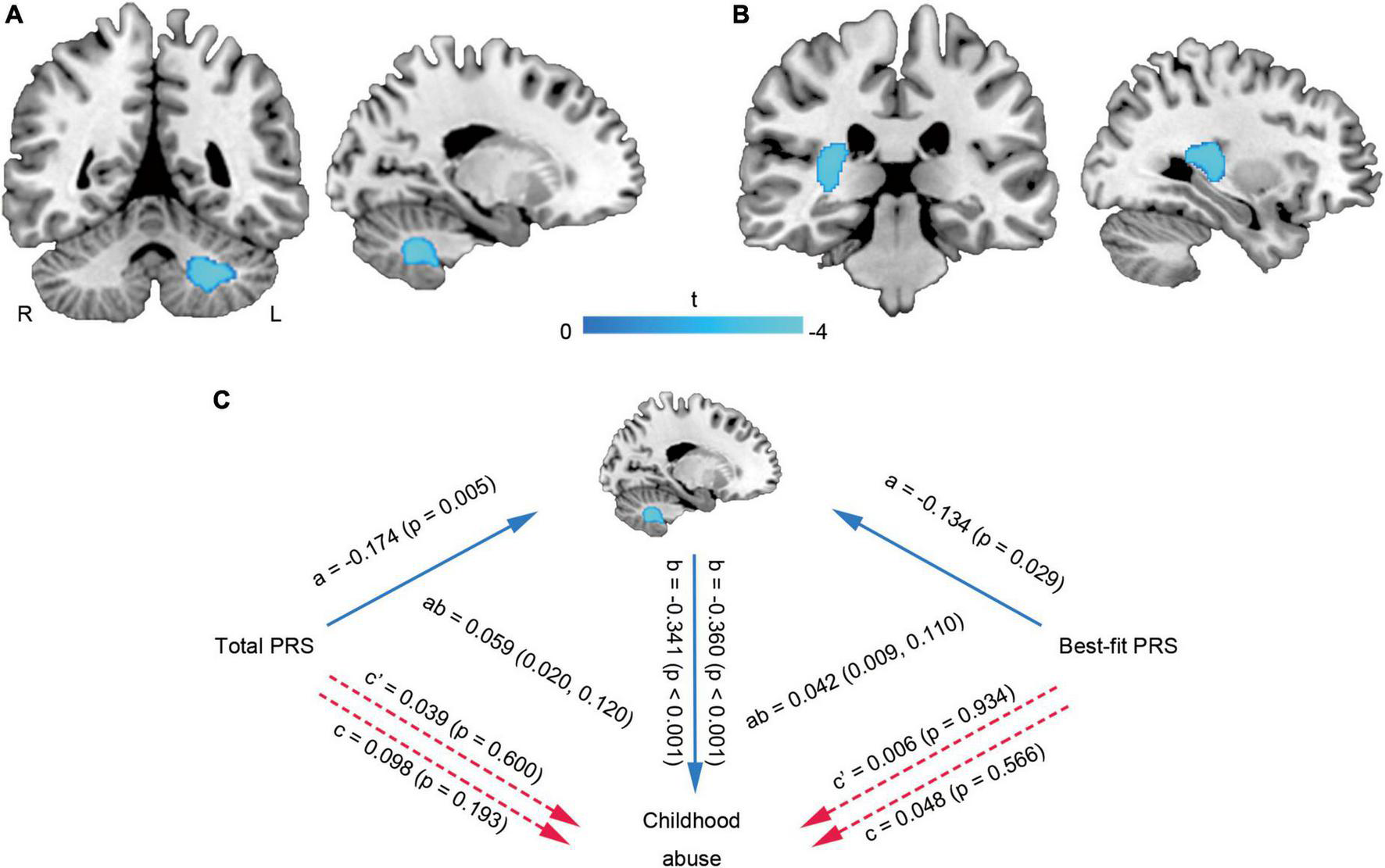 Multiple linear regression showed that the WMVs of left cerebellum cluster (MNI coordinate: −21 −56 −39, 923 voxels, T = −3.90, PFWE–corr = 0.019) (Figure 3A) and right temporal lobe-basal ganglia region (MNI coordinate: 26 −33 12, 895 voxels, T = −4.08, PFWE–corr = 0.021) (Figure 3B) were negatively correlated with the total abuse score. Mediation analysis further found that no matter whether it was the total PRS or the best-fit PRS, there were no significant direct correlations between them and childhood abuse, but there were significant indirect correlations mediated by the cerebellar WMV-change (Figure 3C).