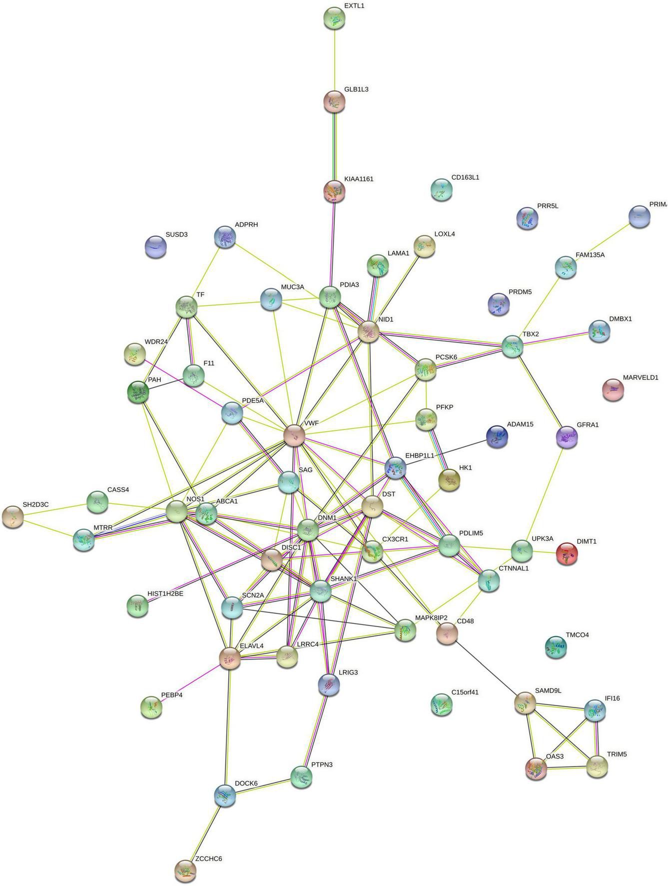 Based on 62 genes significantly correlated with WMV alterations, we conducted PPI network analysis and identified a network consisting of 55 connected proteins and 114 edges (PPI enrichment p-value: 0.060) (Figure 5). According to the degree of nodes (Supplementary Figure 1), the proteins coded by VWF, SHANK1, DNM1, and NOS1 were hub proteins in the PPI network. According to their co-expression values (Supplementary Figure 2), SAMD9L and OAS3 genes, SAMD9L and IFI16 genes, PAH and F11 genes were observed to be highly correlated in protein expression, respectively.