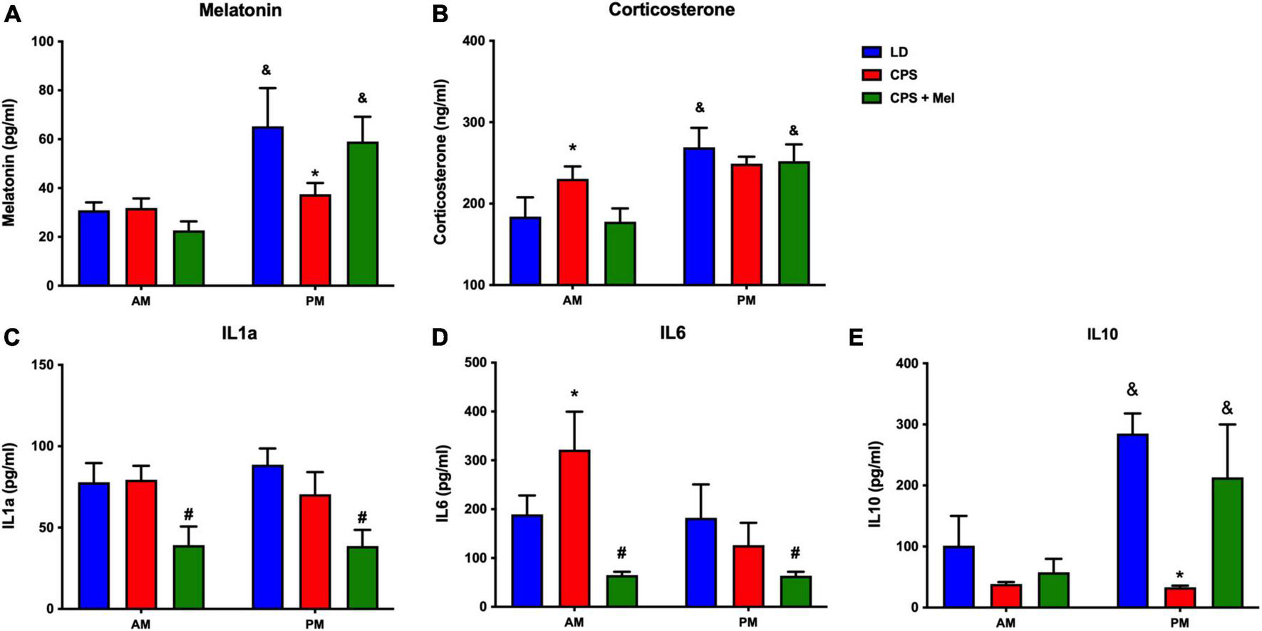 Figure 2. Effect of maternal melatonin supplementation on AM–PM levels of plasma melatonin, and corticosterone, in female 90-day-old offspring (A) and plasma cytokine levels (B). Plasma was collected at 11 and 23 h (n = 6–7 per clock time) in females gestated in LD (blue bars), CPS (red bars), and CPS + Mel (green bars) conditions. Data are mean ± SEM. *Different to LD and CPS+Mel, #Different LD to CPS (P < 0.05 two-way ANOVA and Tukey); &Different to AM period (P < 0.05 unpaired t-test; two-way ANOVA, and Tukey).