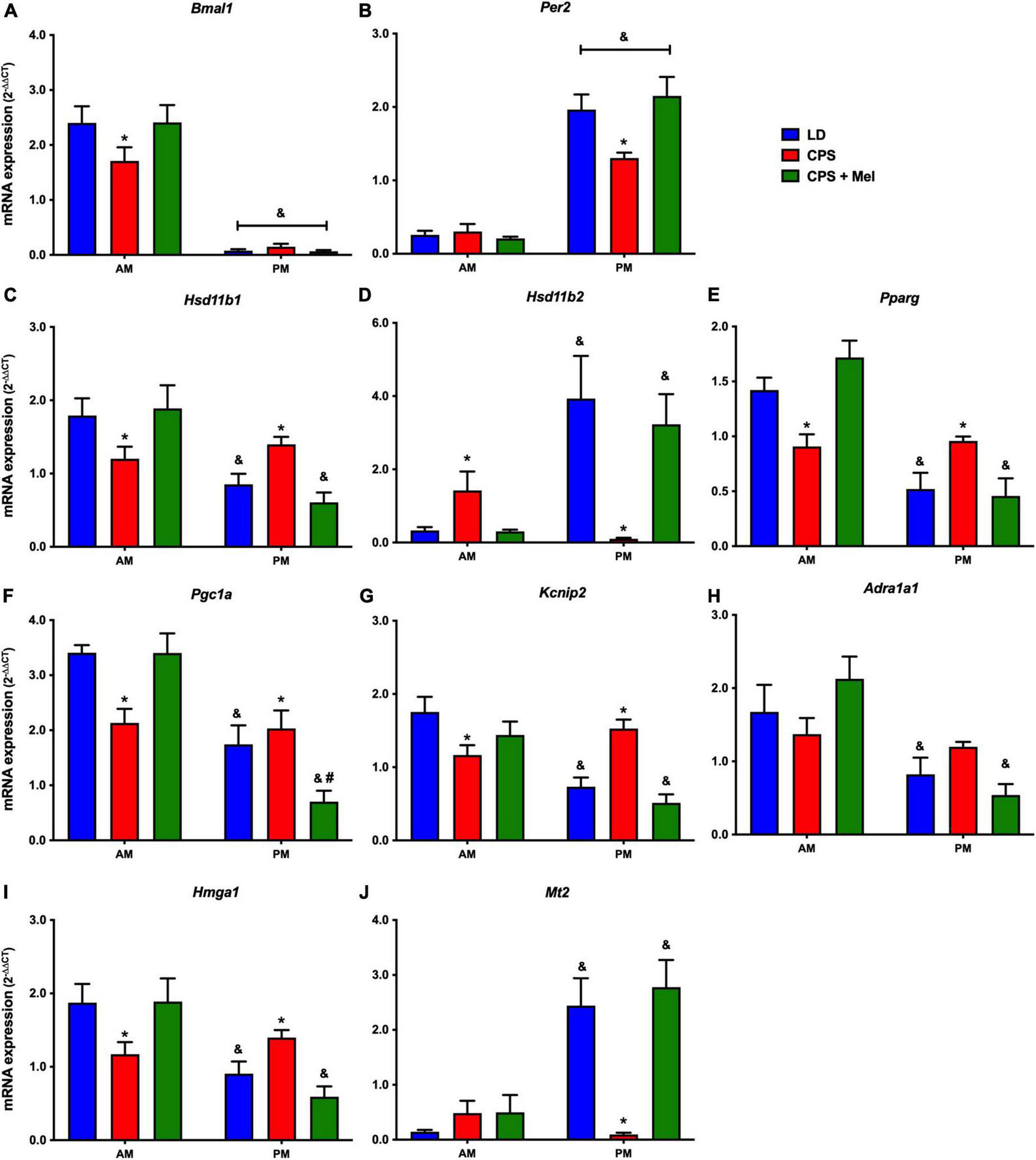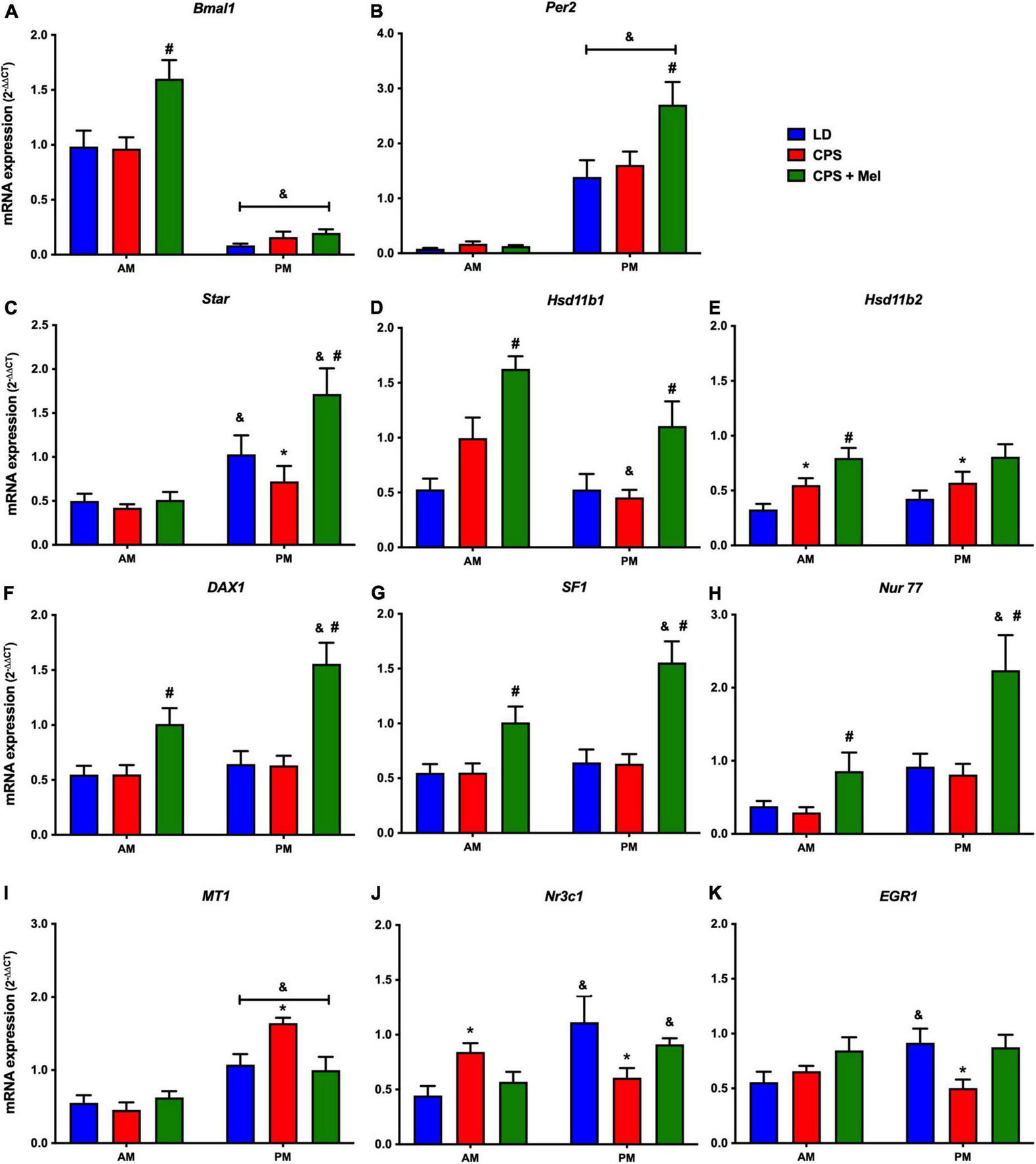 Figure 3. Gene expression in the adrenal gland from adult female offspring. Adrenal glands were collected at 11 and 23 h (n = 6–7 per clock time) in females gestated in LD (blue bars), CPS (red bars), and CPS + Mel (green bars) conditions. Data are mean ± SEM. *Different to LD and CPS+Mel, #Different LD to CPS (two-way ANOVA and Tukey). &Different to AM period (unpaired t-test; two-way ANOVA; and Tukey). Significant differences were ser when p < 0.05.