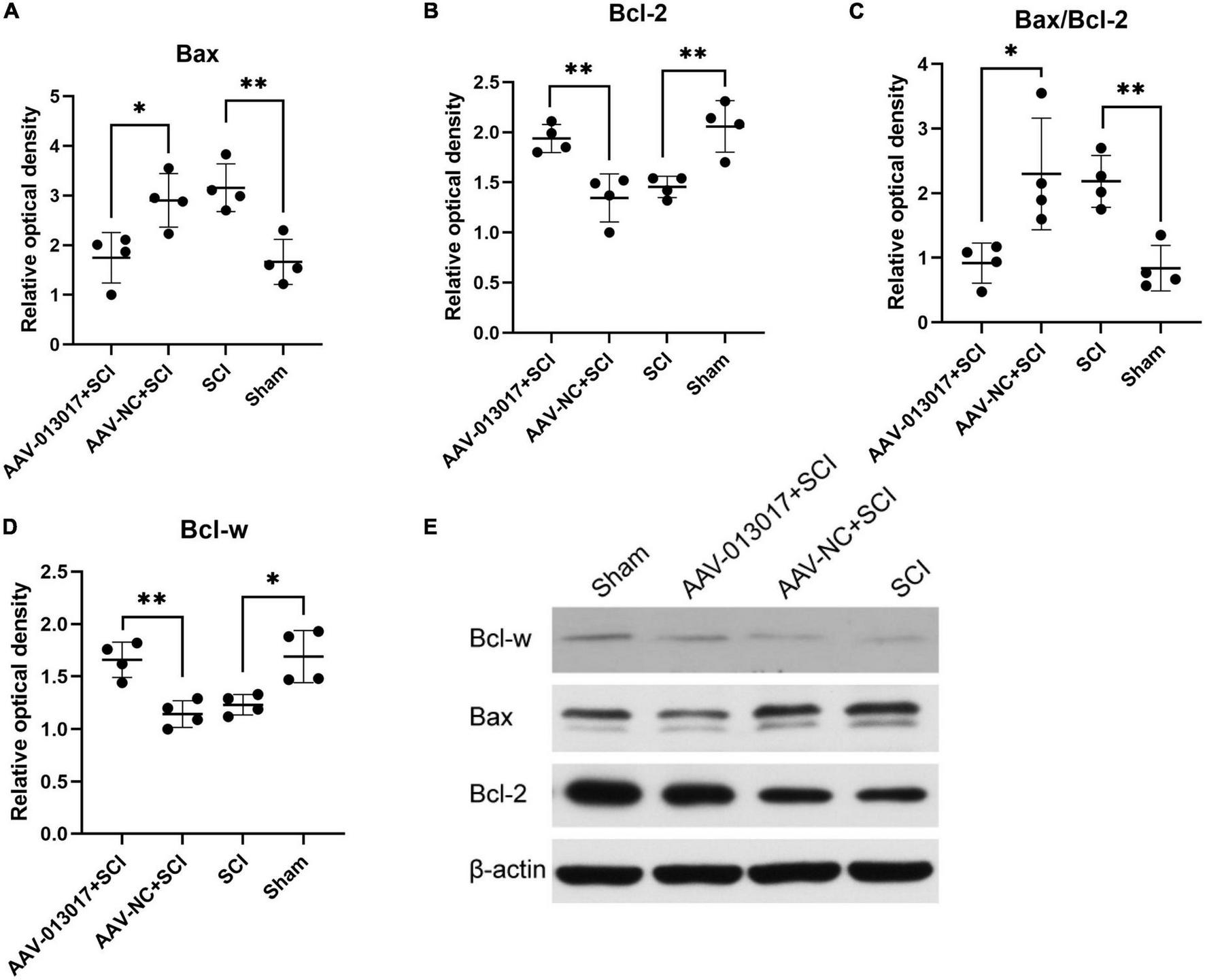 Expression of relative proteins in the spinal cord at 3 days after SCI. (A) The expression level of Bax was significantly altered in all groups at 3 days after SCI (n = 4 per group). (B) The expression level of Bcl-2 was significantly altered in all groups at 3 days after SCI (n = 4 per group). (C) The Bax/Bcl-2 ratio, which is an apoptosis-related indicator, was significantly altered in all groups at 3 days after SCI (n = 4 per group). (D) The expression level of Bcl-w was significantly altered in all groups at 3 days after SCI (n = 4 per group). (E) Protein expression levels of Bcl-w, Bcl-2, and Bax in spinal cord segments in all groups at 3 days after injury (n = 4 per group). Band optical densities were measured using Image J software. *Indicates p < 0.05; **indicates p < 0.01. Data are shown as means ± SD.