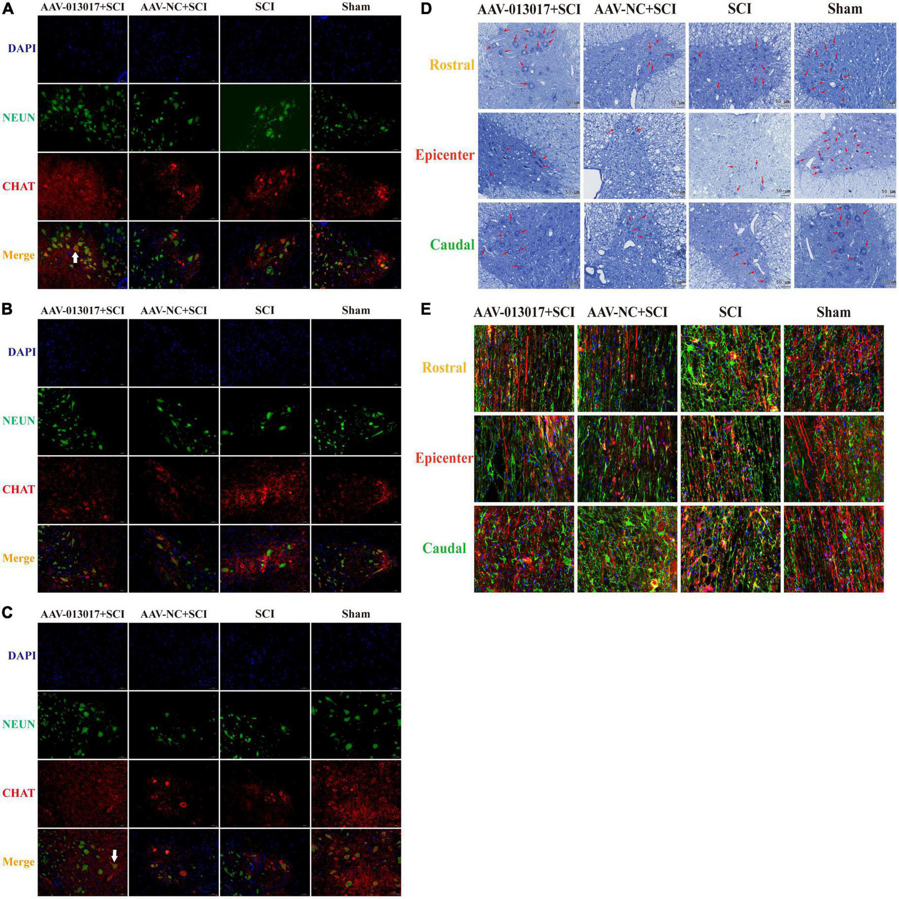 Third, Nissl staining was performed at 3 days after SCI (Figure 2E). Similarly to IF, in the rostral and caudal adjacent segments, more Nissl bodies (indicated by red arrows) in the anterior horn area were seen in the AAV-013017 + SCI group than in control groups, showing higher cell activities after overexpression of target gene. Nissl bodies were normal in shape and blue-stained as blue chrysophoron. In the epicenter, only a few Nissl bodies could be found in the anterior horn in the AAV-013017 + SCI group. Instead, tissue edema, inflammation, poor cell activity, and severe cell damage were seen in the epicenters of injury in rats of all groups after SCI. As seen in quantitative figure (Figure 2F), These results were in line with IF staining, demonstrating different neuronal activities in all groups after SCI, which was likely related to the degree of injury, time of tissue collection, and peak time of neuronal apoptosis.