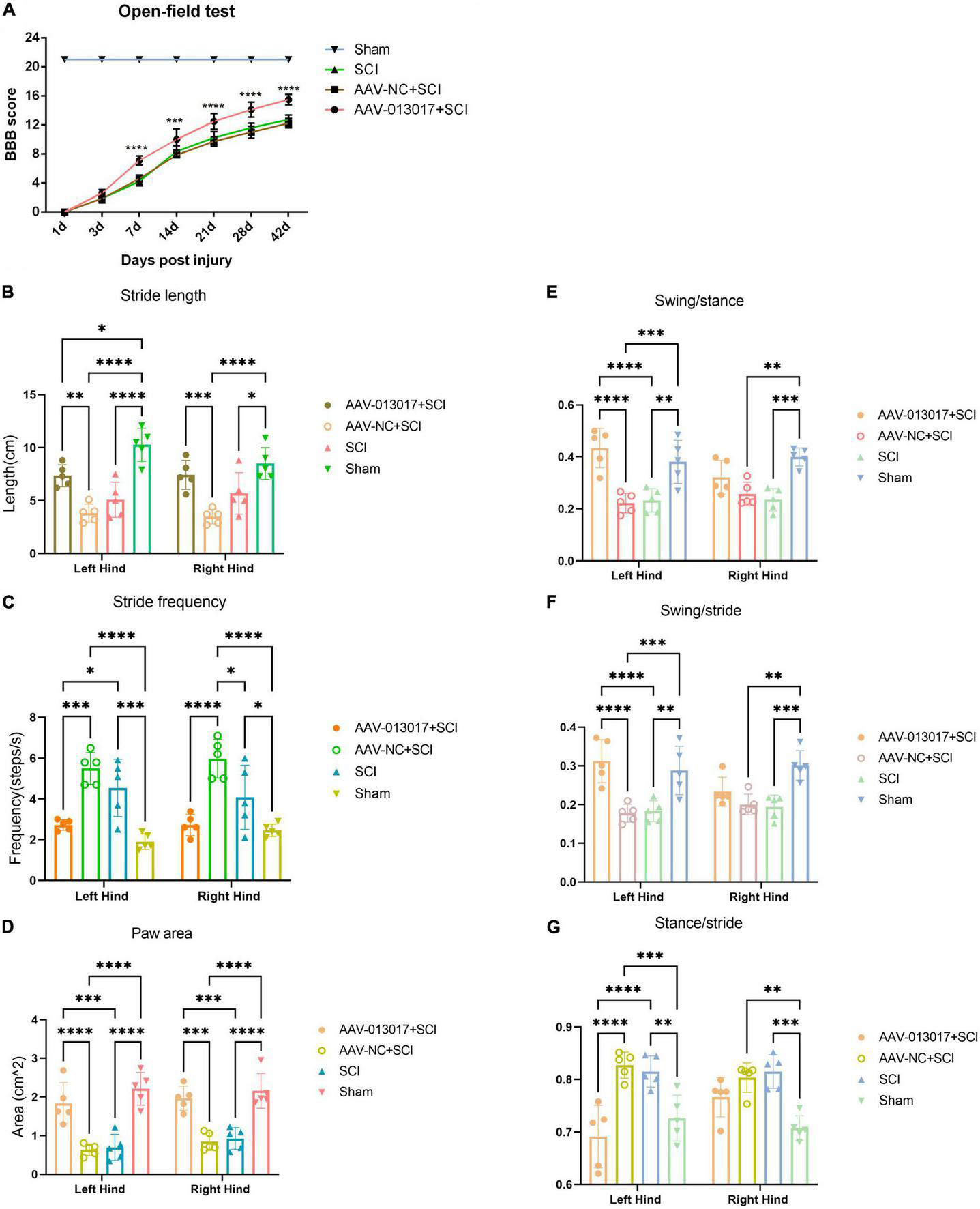 Second, gait analysis was performed at 6 weeks after injury (Figures 7B–G). The results showed that the stride length and paw area were greater, while the stride frequency was lower, for both of the hind limbs of rats in the AAV-013017 + SCI group than control groups, with statistical significance. Moreover, the swing/stance was significantly higher, while the swing/stride and stance/stride were significantly lower, especially for the left hind limbs, of rats in the AAV-013017 + SCI group than in the control groups. Besides, seen in Supplementary Figure 7, the gait summary and footprint pictures of rats for different groups were shown, which suggested that distances between forelimb and hindlimb of rats were smallest in AAV-013017 + SCI and sham group. Together, these results showed that rats in the AAV-013017 + SCI group were similar to the rats in sham groups, indicating a locomotor improvement of rats after gene therapy.