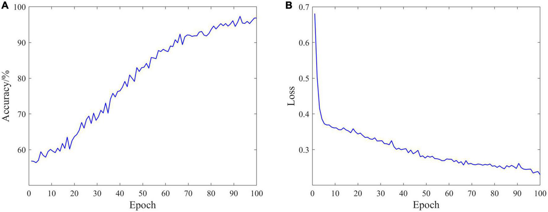 Classification performance of the coherence-based graph convolutional network (C-GCN) model. (A) Accuracy distribution of the C-GCN model. (B) Loss distribution of the C-GCN model.