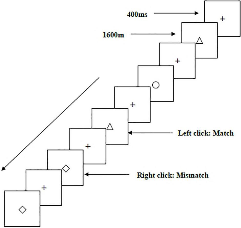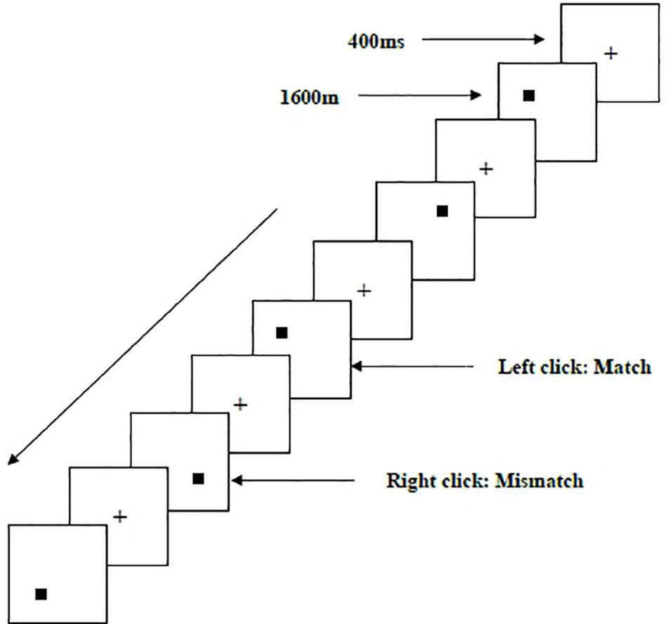 Two types of WMU tasks—a spatial two-back task (Figure 1) and an object two-back task (Figure 2)—were presented to all participants. The stimulus materials for the two tasks were small black squares and 12 geometric figures, respectively. A black stimulus material was presented on a white background with an approximate visual angle of subtending 1.5° × 1.5° and a width and height of 2.0 cm each. Each stimulus sequence comprised 122 trials. In each trial, a fixation point marked by a black “+” appeared for 400 ms, followed by an objective stimulus material presented for 1,600 ms (Salmi et al., 2019). When the two-back target was consistent with the stimulus being presented (match), each participant clicked the left mouse button as required; when the two were inconsistent (mismatch), participants clicked the right mouse button. The order of stimulation sequence for each participant was randomized. Before the start of each stimulation sequence, the experimenter informed the participant about the type of task to be performed.