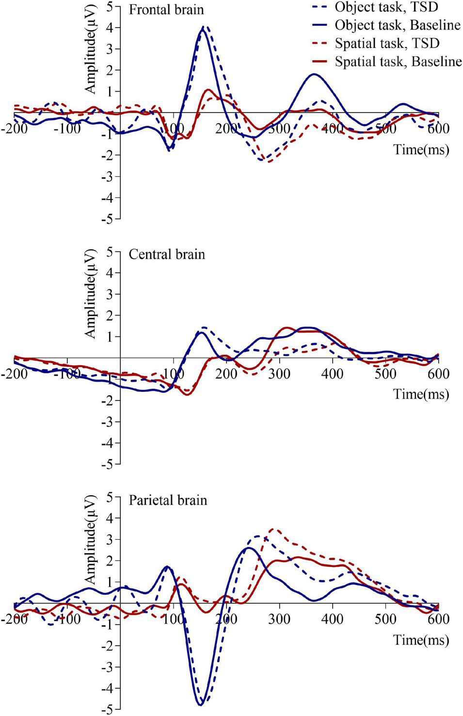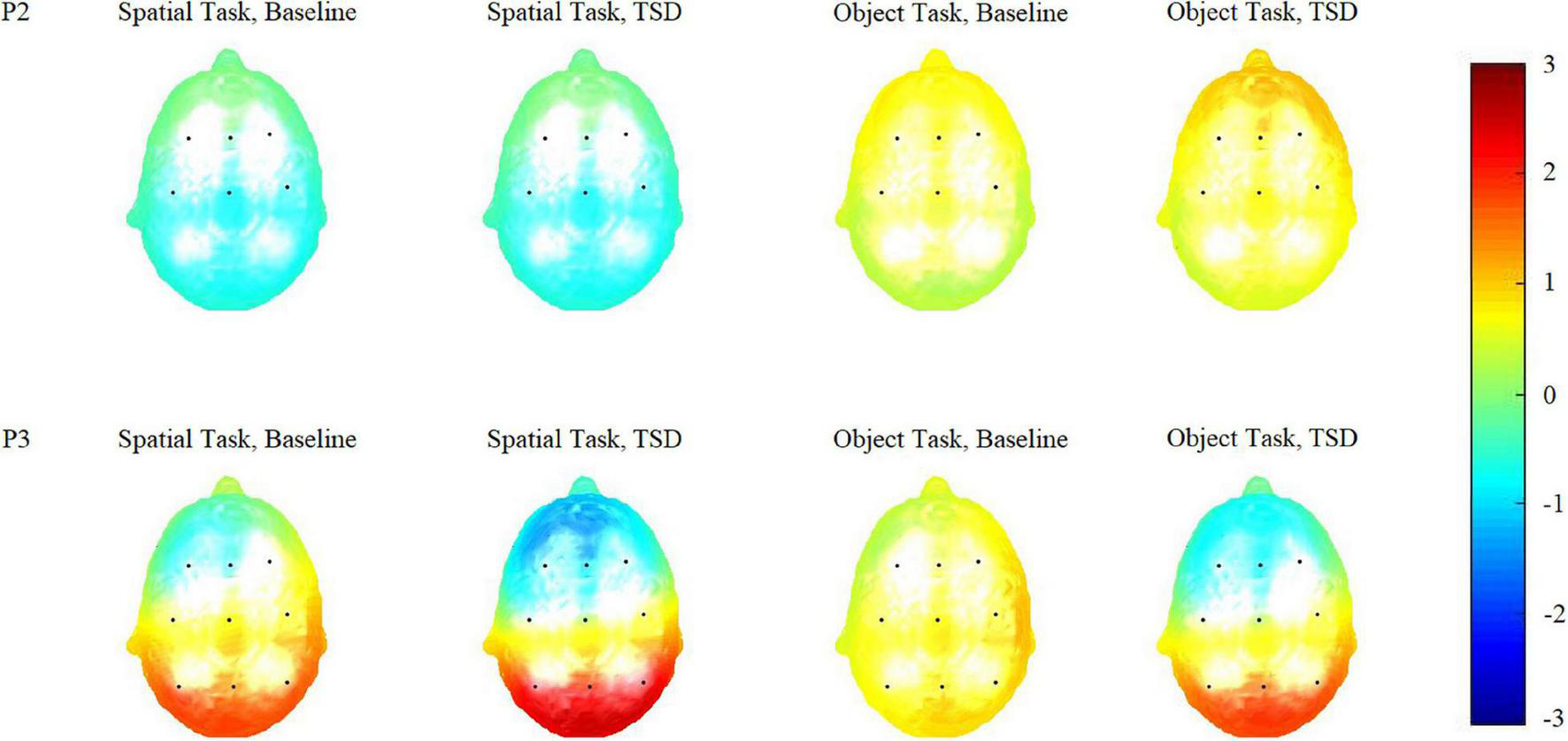 The most important finding of the current study was the selective alteration of P3 amplitudes after TSD, reflecting TSD impairs cognitive functions in the frontal and central brain regions and triggers the event-related compensatory neural activity in the parietal brain regions.