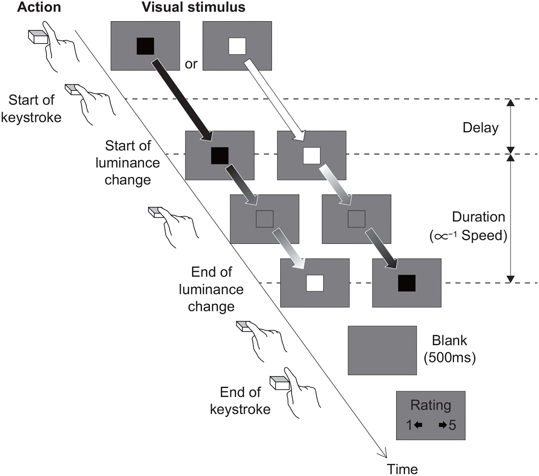 Stimulus parameters to determine the sense of agency have been examined in perceptual and cognitive studies. In particular, a delay between an action and its effect is a contributing factor to a deterioration in the sense of agency (Shanks et al., 1989; Sato and Yasuda, 2005; Asai and Tanno, 2007; Farrer et al., 2013; Kawabe, 2013; Kawabe et al., 2013; Wen et al., 2015a,b). There are several explanations for the effect of delayed feedback on the sense of agency. First, the majority of studies assume that the brain has a comparator for predicted and actual sensory feedback of an action. When the comparator detects a delay between an action and its feedback, the brain interprets that the feedback is not triggered by the action and tries to calibrate the prediction system for future feedback (Blakemore et al., 1998, 1999; Haggard et al., 2002; Chambon et al., 2014; Swiney and Sousa, 2014 but also read Synofzik et al., 2008). Another line of study tries to explain the sense of agency in terms of cross-modal grouping. Specifically, with a large temporal separation between a participant's own keystroke and the feedback it triggers, cross-modal perceptual grouping (or cross-modal perceptual correspondence between them as suggested by Nishida and Johnston, 2002; Fujisaki and Nishida, 2007) is impaired and this perhaps reduces the sense of agency (Kawabe et al., 2013).