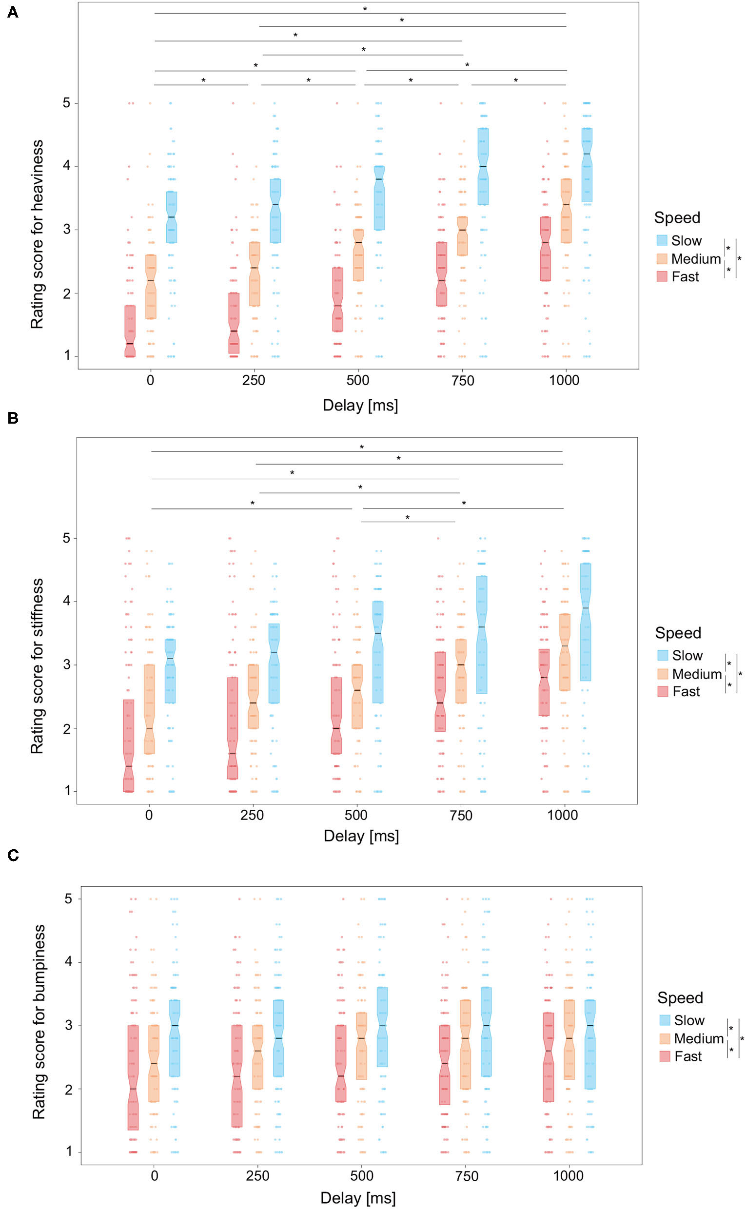 Experiment 1 results. Box plots of (A) heaviness rating scores, (B) stiffness rating scores, and (C) bumpiness rating scores for each of the speed conditions as a function of the delay. Asterisks denote the pairs for which the means were significantly different using the EcolUtils package (Bonferroni-corrected p < 0.05).