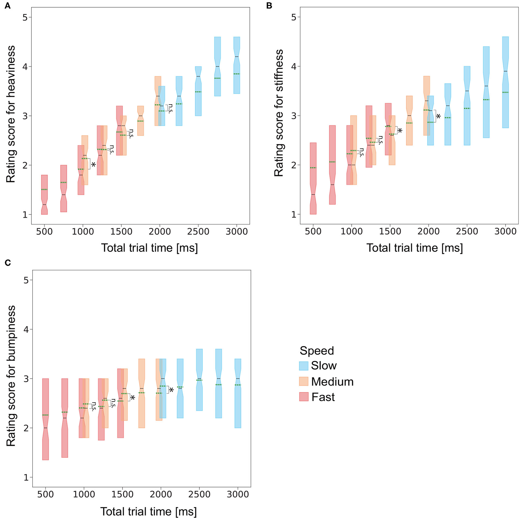 Box plot of the (A) heaviness, (B) stiffness, and (C) bumpiness rating scores as a function of total trial time. Green dashed lines denote the averaged values of the rating scores. The Asterisks and n.s. denotes that the difference was significant (i.e., Bonferroni corrected p < 0.05) and not significant (i.e., Bonferroni corrected p > 0.05), respectively.