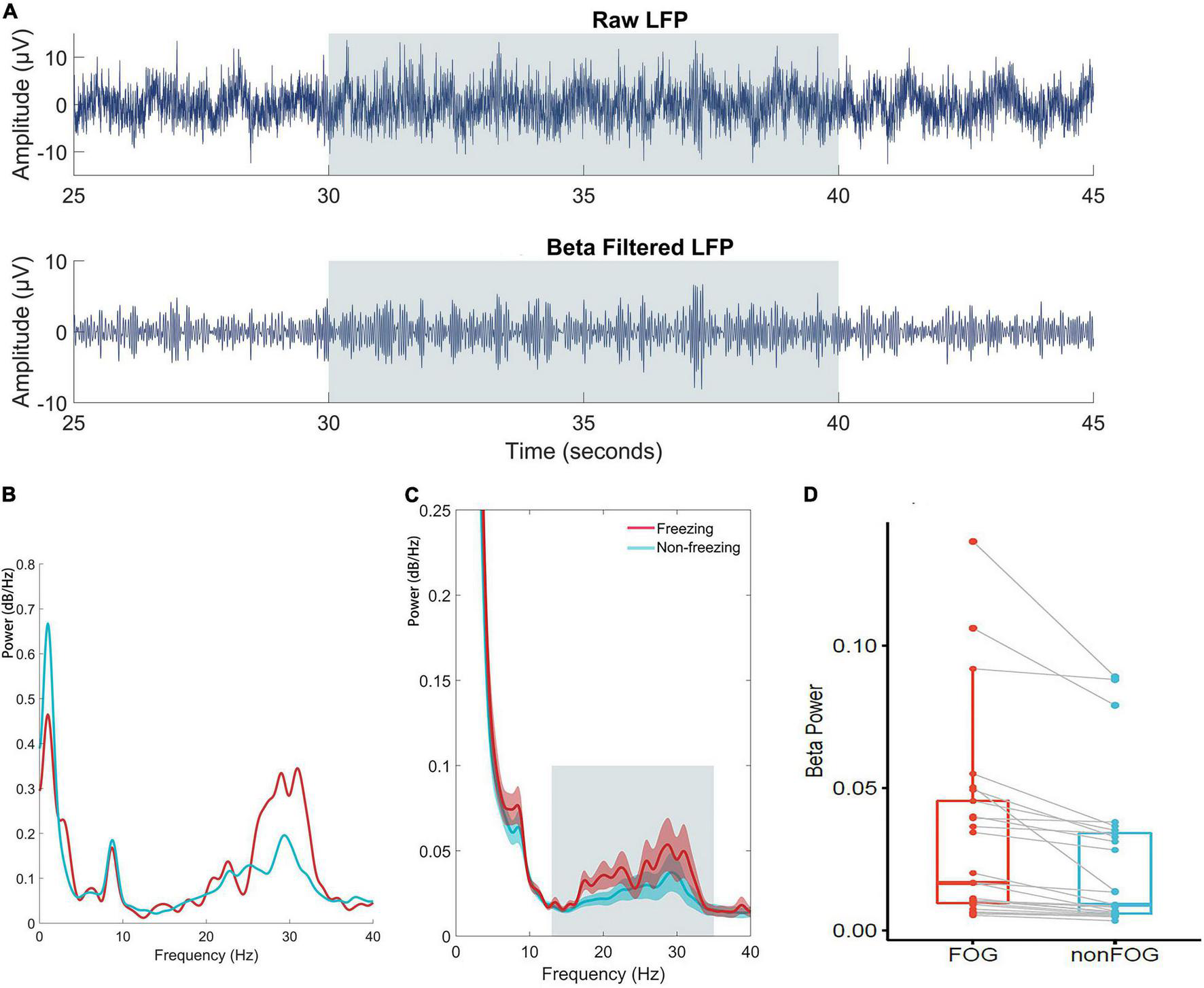Figure 5. (A) Time series of raw and beta band filtered LFP. (B) An individual case illustration of power spectrum density of LFP in the STN between freezing and non-freezing period; The red line represents the power spectrum of LFP during FOG, and the blue line represents the power spectrum of LFP during non-FOG. (C) The group analyze of power spectrum density averaged by all included walking epochs. The shaded error bar indicates SEM and the gray square indicates beta range. (D) Statistical comparison of averaged beta band power of LFP between conditions at trial level indicated significantly increased beta power during freezing (P<0.05).