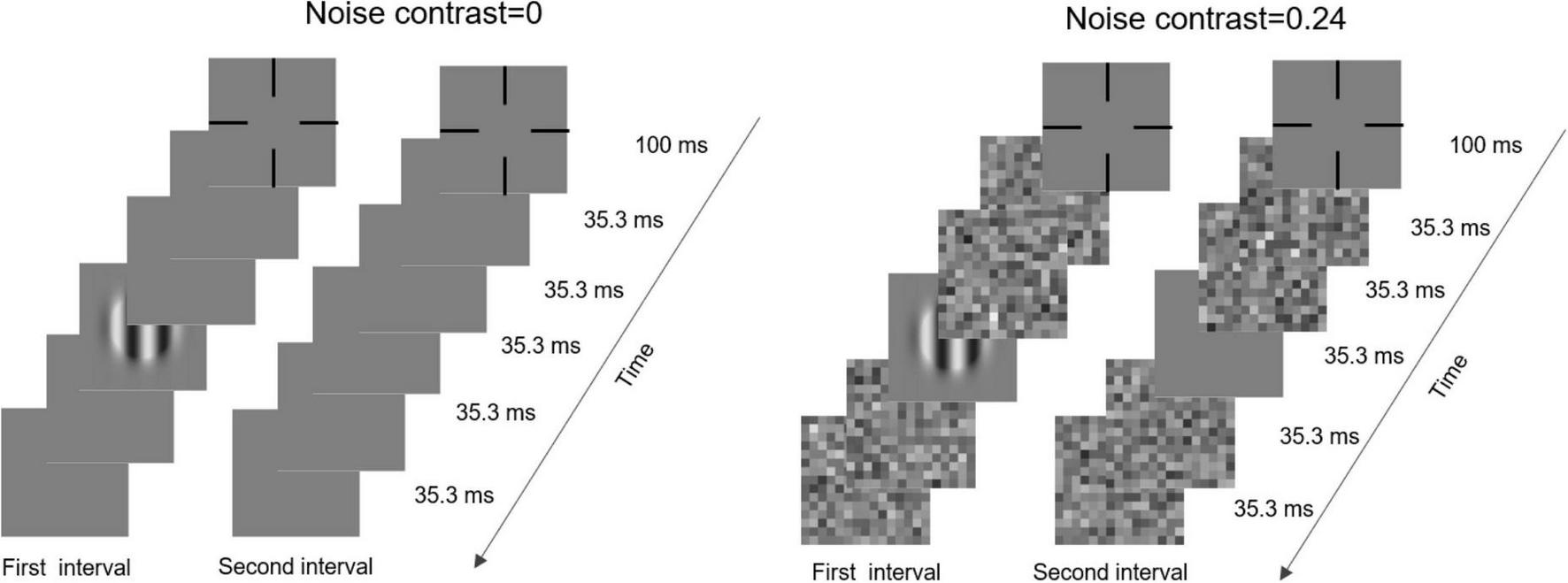The contrast sensitivity was measured by a contrast detection task (Figure 1). In each trial, two intervals were presented and divided by a 500-ms blank. Each interval contained two frames of blank, one frame of blank or grating, and another two frames of blanks and were initialized by a fixation cross, which lasted 100 ms. Each frame lasted 35.3 ms. Under noisy conditions, the two front and back blanks were replaced by noise images. Subjects were instructed to judge which interval included the grating by pressing the buttons of a game controller. A brief beep was presented after each response regardless of whether it was correct.