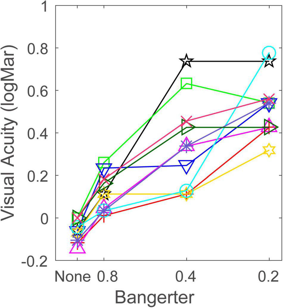 Visual acuity (log MAR) at each Bangerter filter strength. Each symbol and color denotes one subject.