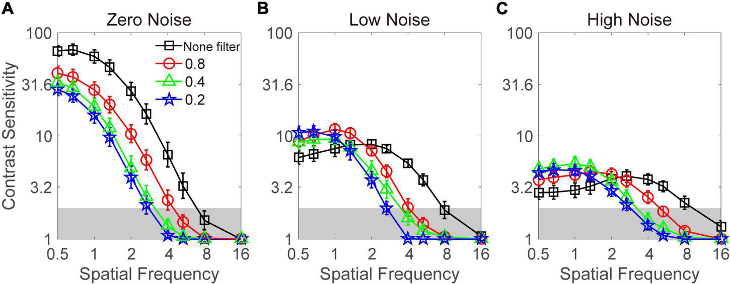 Contrast sensitivity functions under zero- (A), low- (B), and high- (C) noise conditions. Dark lines with square symbols, red lines with circle symbols, green lines with triangle symbols, and blue lines with pentagram symbols denote contrast sensitivity with none filter and at the 0.8, 0.4, and 0.2 filter levels, respectively. Data were averaged across subjects. Shaded regions denote contrast sensitivity which is lower than 2. Error bar denotes standard error.