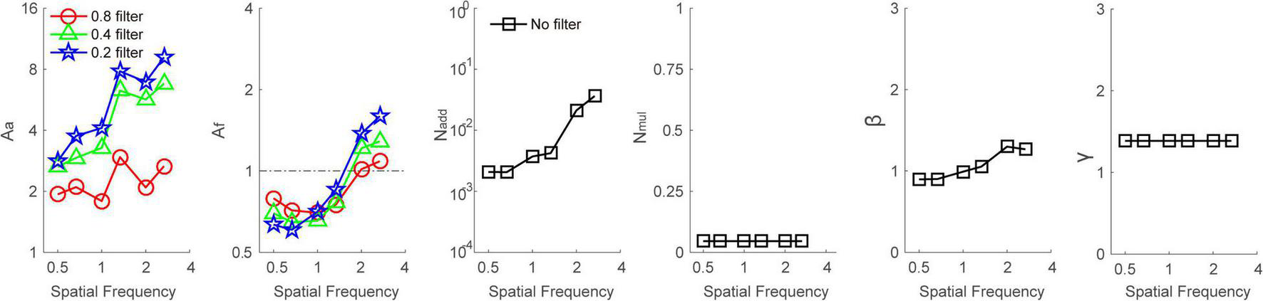 A a , Af, Nadd, Nmul, β, and γ as a function of spatial frequencies at baseline (dark square), 0.8 (red circle), 0.4 (green triangle), and 0.2 (blue pentagon) filter levels, respectively. Different viewing conditions shared Nadd, Nmul, β, and γ.