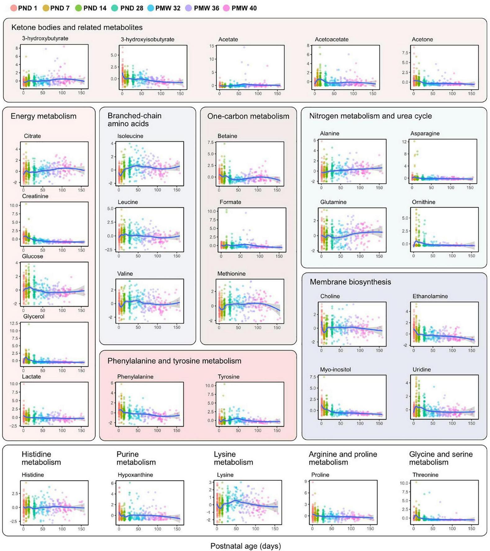 Metabolite levels over postnatal age (days). Individual sample values are plotted and colored according to time point as indicated in the legend. Lines represent smoothed conditional means with 95% confidence intervals (shaded areas). Y-axis shows z-score normalized metabolite abundances.