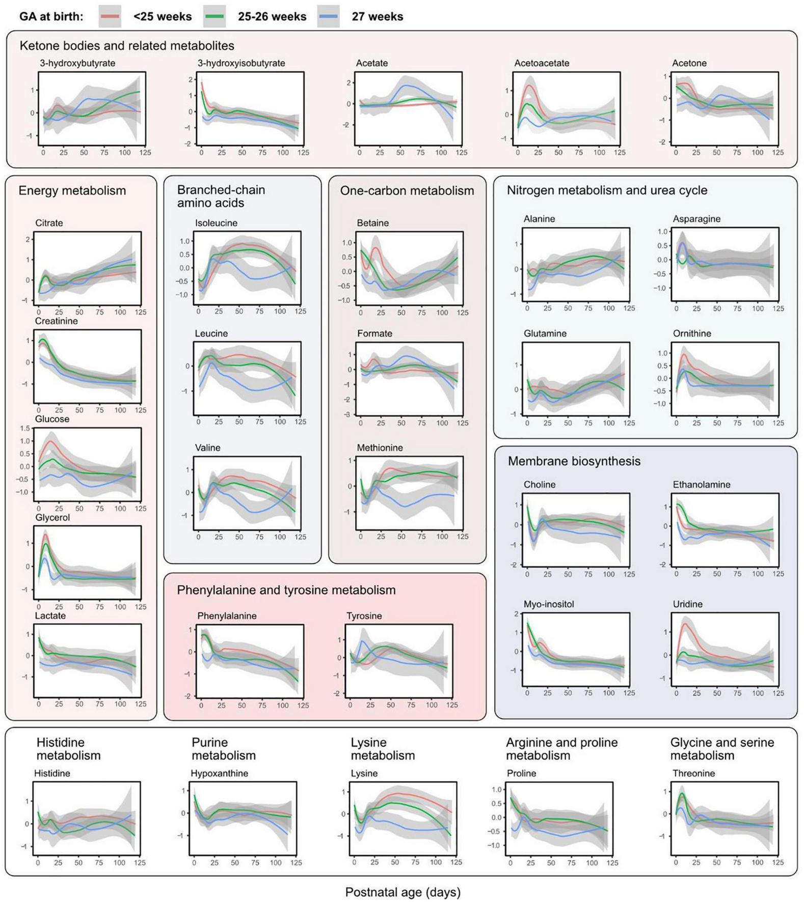 Metabolite levels over postnatal age (days) by gestational age (GA) group. Accordingly to the legend, metabolite levels were stratified by GA at birth. Lines represent smoothed conditional means with 95% confidence intervals (shaded areas). Means are only shown up to day 120 due to few samples in each group at later time points. Y-axis shows z-score normalized metabolite abundances.